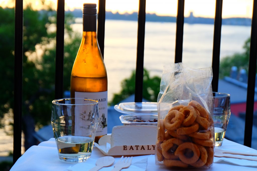 Wir gehen zum Feinkostgeschäft „Eataly“, dessen Leckereien wir bereits in München kennen gelernt haben. In aller Ruhe füllen wir unseren Einkaufskorb mit den unwiederstehlichen Köstlichkeiten Italiens. Bella Italia in Schweden. Wir wandeln hinaus und vergessen vorher als Gegenleistung die Kronen rauszuholen. Kurze Zeit später befinden wir uns bei bester Aussicht und besonderer Atmosphäre auf unserem Balkon hinter „schwedischen Gardinen“…