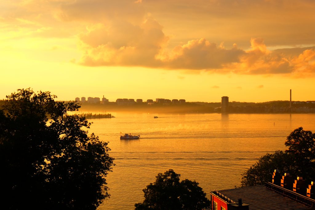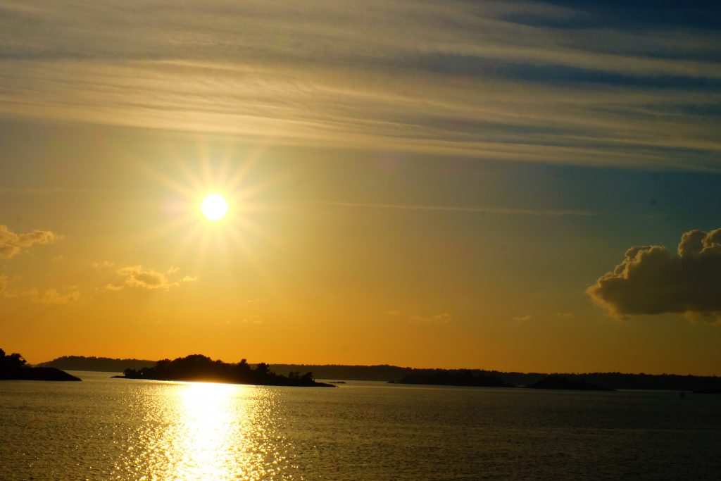 Ein wunderbarer Geburtstag geht so langsam zu Ende. Im Sonnenuntergang gleiten wir durch die Schärenwelt zurück nach Nacka Strand.