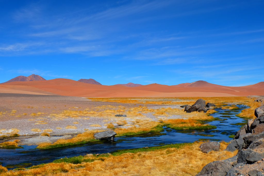 Im Schatten unseres Hausvulkans Licancabur schrauben wir uns auf eine Hochebene von bald 4.300 Höhenmetern. Dabei quält sich der Suzuki Grand Nomade im 2. Gang und gerade mal mit 20 Kilometern pro Stunde die steilen Kurven hinauf. Doch wir sind immer noch etwas schneller als die donnernden Camiones. Wir halten uns auf der Ruta 27 Richtung Westen und passieren in nur 8 Kilometer Entfernung die bolivianische Grenze.