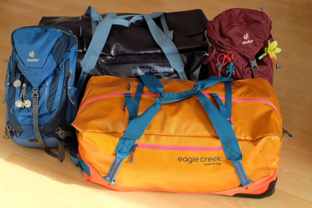 „Klamotten und Gedöns für ein halbes Jahr? Ihr könnt doch bestimmt 23 Kilo oder noch mehr pro Person mitnehmen, oder?“, werden wir oft gefragt. Ja, können wir. Tun wir aber nicht. Keine Staubjacke, keine Übergangshose. Locker leicht machen wir uns an die Sache und packen für `ne gute Woche. Halt das, was man(n) und frau so braucht. Dabei müssen wir Temperaturen berücksichtigen, die vom Gefrierpunkt bis zu 40 Grad plus reichen und mit knaller Sonne, Wolken, Regen, Sturm und Frostbeulen freudig einhergehen. Und wenn die Schmutzwäsche langsam überhand nimmt, dann geht’s halt zum Fluss oder zum Waschsalon. Und dort stimmen wir dann gemeinsam mit dem richtigen Rhythmus ein: „Wisch-Wasch, Wisch-Wasch, Wisch-Wasch, Wisch-Wasch, Wisch-Wasch“ Die handliche Fotoausrüstung, elektrisches Equipment sowie Werkzeug gehören dazu. Ebenso die kleine Wander-Apotheke und einige Artikel für die Körperpflege. Fertig. Die beiden Duffle-Taschen sind voll. Viel zu voll!!! Wie das denn?! Also nochmal alles raus und noch weniger rein. Passt immer noch nicht. Nochmal alles raus und noch mal weniger rein. Na ja, geht so. Dann entwickeln wir eine neue Taktik: Wir sortieren hin und her zwischen Reisetasche und Handgepäck. Na ja, geht so. Und nochmal alles raus und noch weniger rein… Und nochmal, und nochmal, und… Dieses lustige Spiel geht dann solange in die Nachspielzeit, bis dann endlich alles passt, abgepfiffen wird, wir gewonnen haben und in die Kabine dürfen. Und ganz ehrlich: Spätestens am zweiten Outdoor-Tag sehen wir sowieso aus wie „Schweini“…