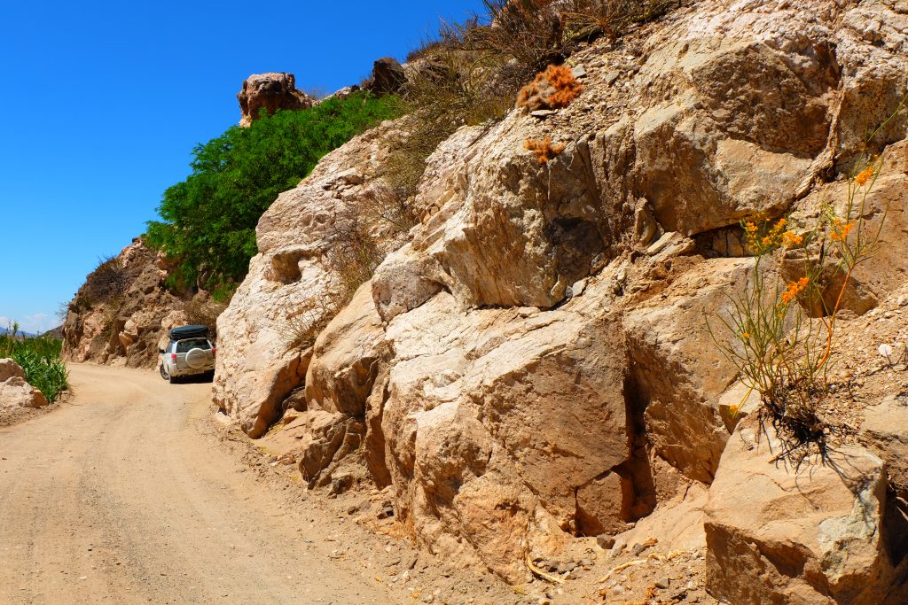 Die Weiterfahrt ist einfach. Nach dem Pueblo Londres geht es 20 Kilometer stur geradeaus, dann eine zarte Linkskurve, dann erneut 20 Kilometer nur geradeaus, dann eine rechts-links Kombination und weitere 10 Kilometer nur geradeaus. Warum hat der Wagen keinen Tempomat?