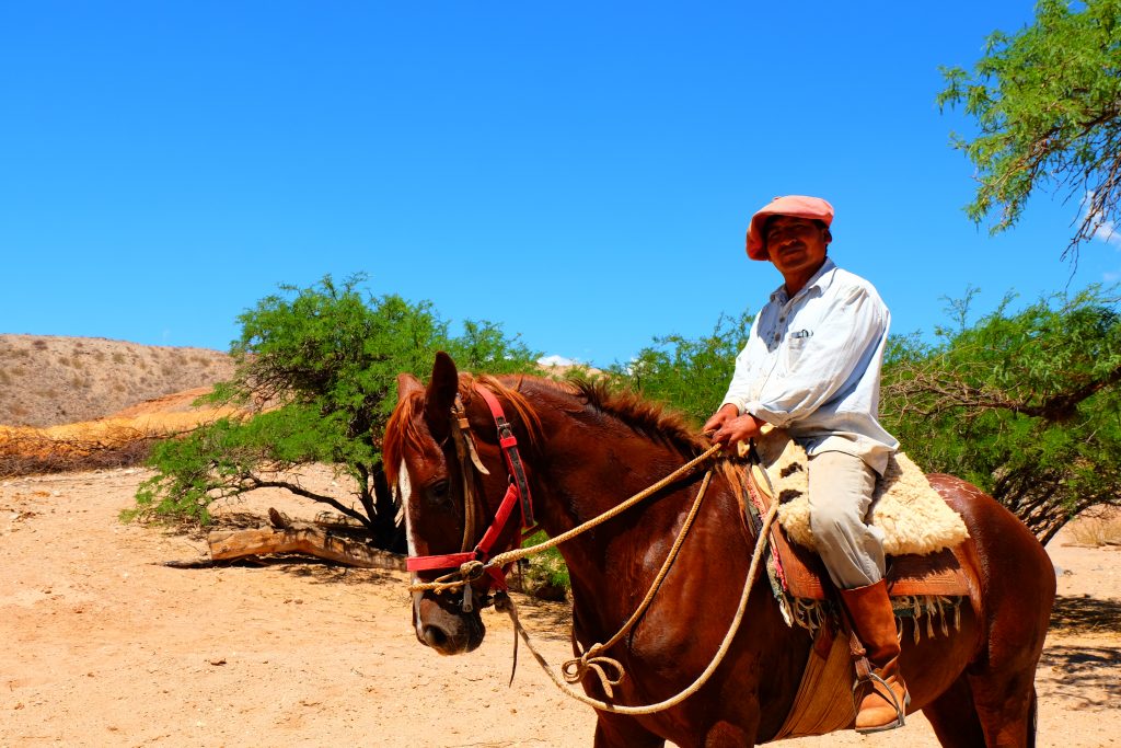 Um nach Cafayate zu gelangen müssen wir weitere 100 Kilometer Ruckelpiste fahren. Entschädigt werden wir durch die grandiose Landschaft, die sich bald nach jeder Kurve neu präsentiert. Ein Farbenspiel folgt dem nächsten, eine Bodenbeschaffeheit der anderen: Staub, Grau, Sand, Weiß, Stein, Rot, Felder, Grün, Getreide, Gelb, Wein, Hellgrün. Und dann steht ein Reiter am Wegesrand. Wir halten an und ich frage: „Usted es un Gaucho?“ „Si, claro. Un Gaucho de caballos.“ Aber was für eine Frage. Ich hätte auch fragen können: „Sind Sie der Weihnachtsmann?“ Mann, Mann, Mann. In Angostaco machen wir eine kleine Rast inmitten von irren Bergformationen. Martina sagt: „Man kann das nicht alles in einem Foto festhalten. Diese unendliche Weite. Vielleicht filmen. Doch auch das ist dann nur ein Teil dieser Grandiosität“.