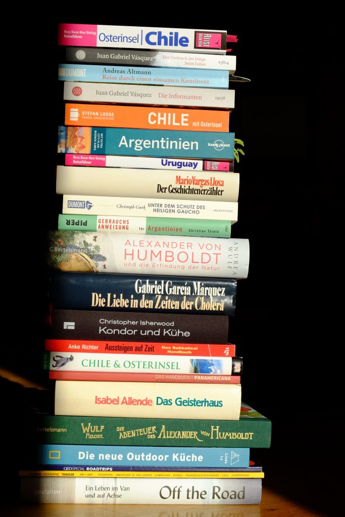 Informationen. Wir brauchen Informationen. Und da ist der „richtige“ Reiseführer Gold wert. Da es diesen einen nicht gibt, ist eine Kombination mehrerer recht sinnvoll. Gut, dass Martina die Weltmeisterin im quer lesen ist und dabei das Wesentliche zur Planung unserer Route schnell herausfiltert. Anekdoten und Geschichten, die auf dem südamerikanischen Kontinent spielen, sind eher mein Part. Da kommt Herr Humboldt gerade rechtzeitig um die Ecke… Nicht abgebildet sind die unzähligen und wertvollen Reise-Blogs, in denen wir hilfreiche Hinweise, Tipps und Kontakte finden. Bitte nennt mir einen Blog, den Martina nicht gelesen hat 😉