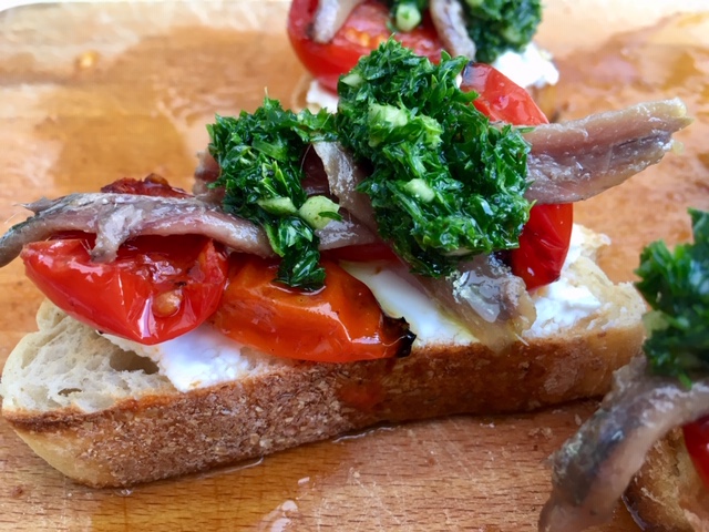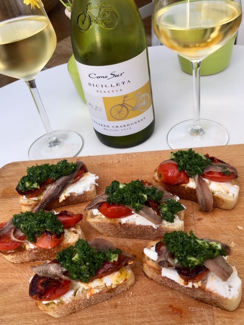 … mit gebräunten, naja, eher zart geschwärzten Tomatenhälften, feinem Bûcheron-Ziegenkäse aus dem französischen Loiretal, Sardellen und einer Sauce aus gehackter Großheide-Petersilie, bestes Olivenöl und frischen Knoblauch Stückchen. Dazu passt hervorragend ein sehr gut gekühlter „Bio Chardonnay Bicicleta Reserva unoaked“ von Cono Sur aus Chile. Alle Angaben sind für 8 Personen. Warum sollen wir daran etwas ändern? Was für ein Gaumen-Auftakt aus dem neuen Buch! Muchas gracias a la cocinera.