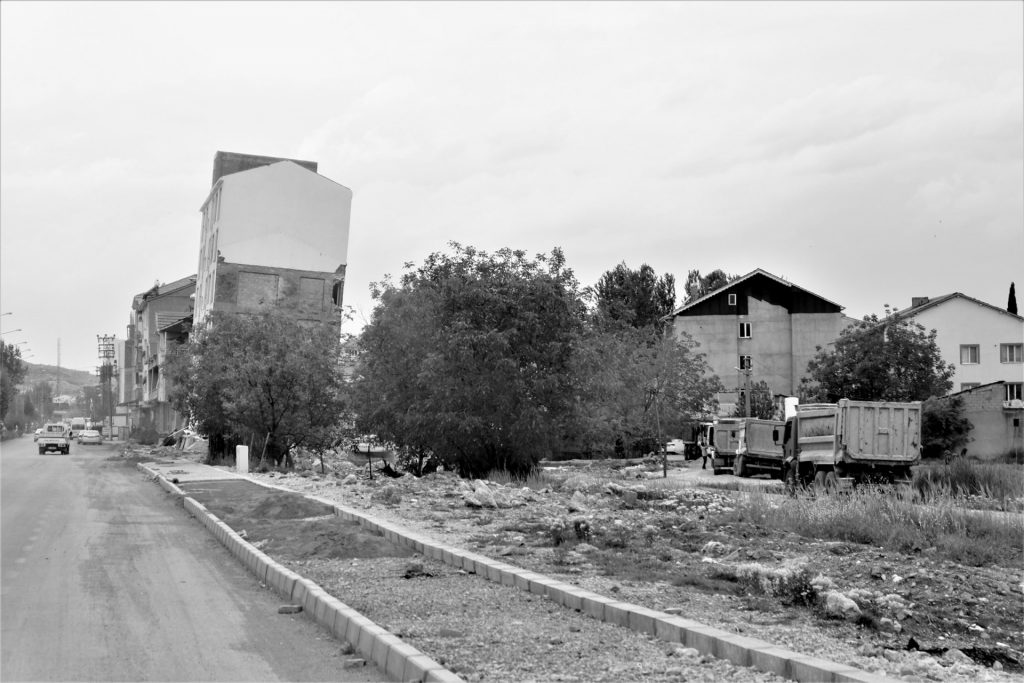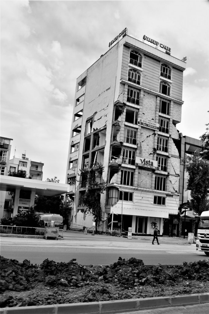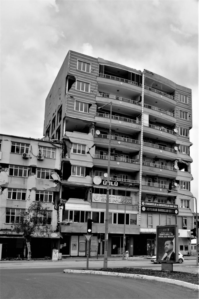 Wir hätten es echt nicht erwartet, doch wir werden auf der weiteren Strecke eine zeitlang immer wieder mit den Folgen des verhehrenden Erdbebens von Februar konfrontiert, obwohl wir über 100 Kilometer vom eigentlichen Epizentrum unterwegs sind. Schief stehende Häuser, Schuttberge, in sich zusammengebrochene Häuser, weggebrochene Häuserfassaden, die einen Blick auf die ehemalige Wohnung freigeben, abgetragene Dächer, Bagger, die Abrissarbeiten durchführen … einfach furchtbar. Vor allem für die vielen betroffenen Menschen, die notdürftig in Zelt- und Containerlagern untergebracht sind. Für wie lange werden sie auf ihr altes Leben verzichten müssen und diese Situation aushalten?!