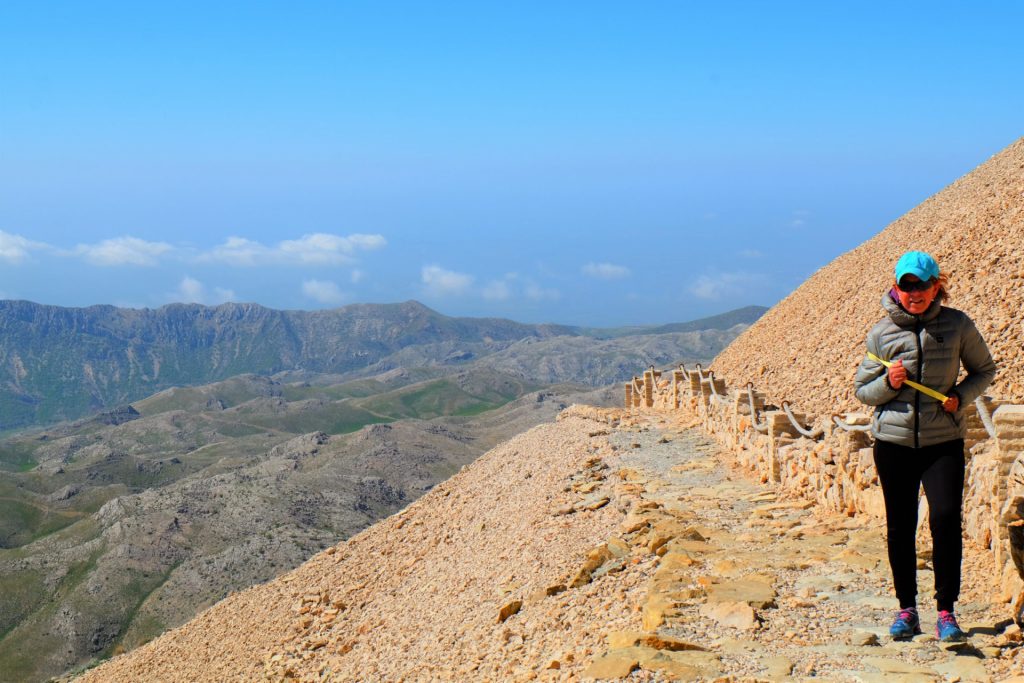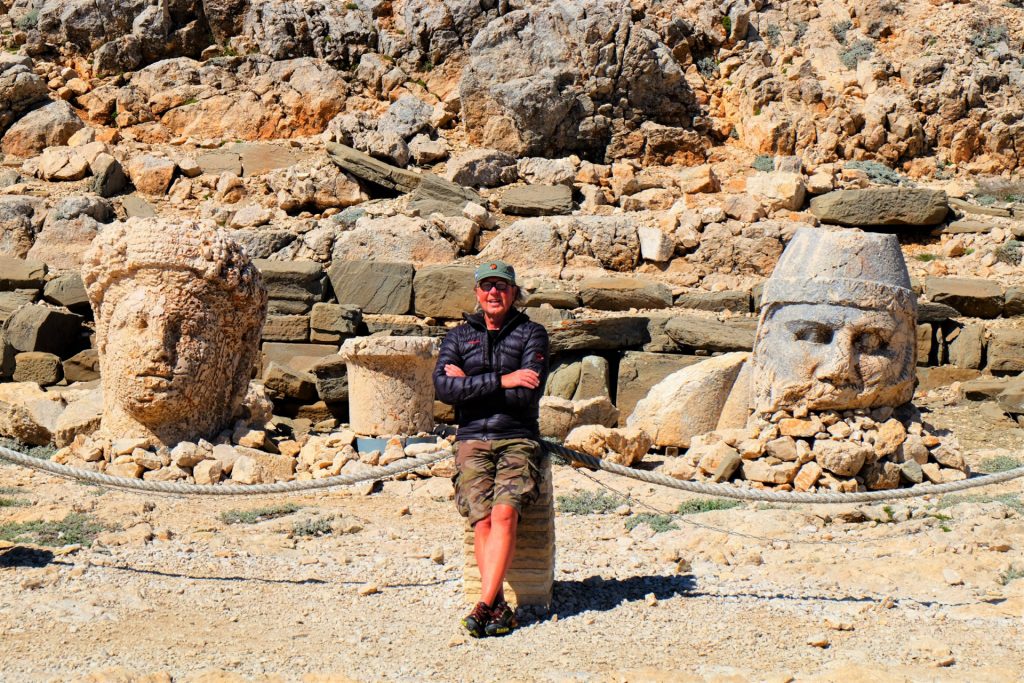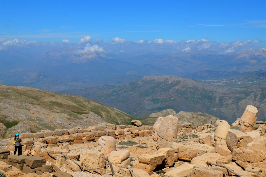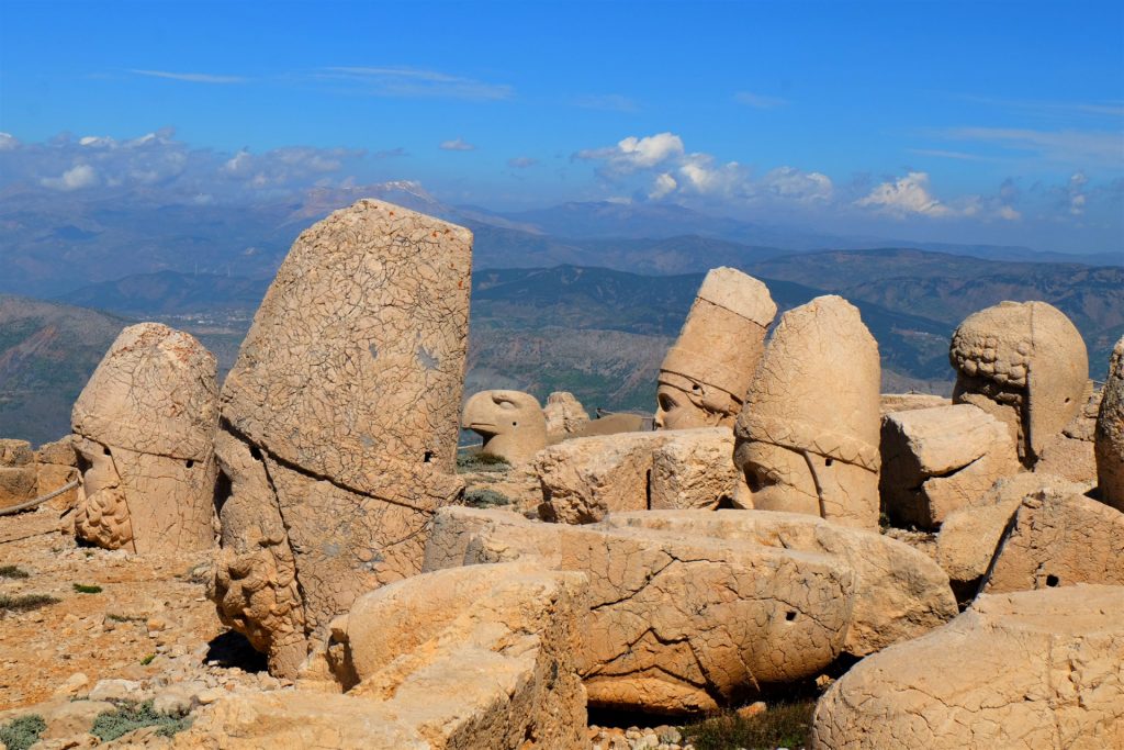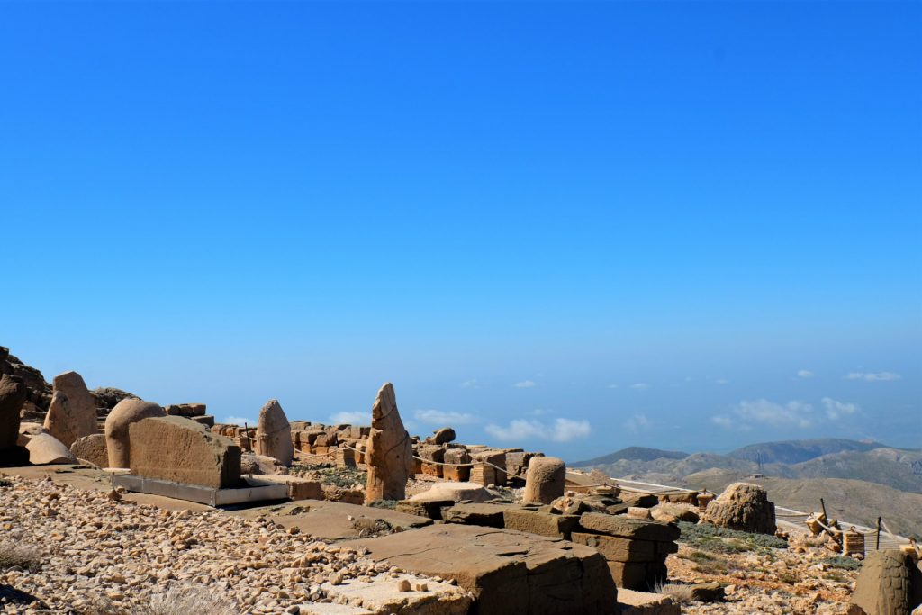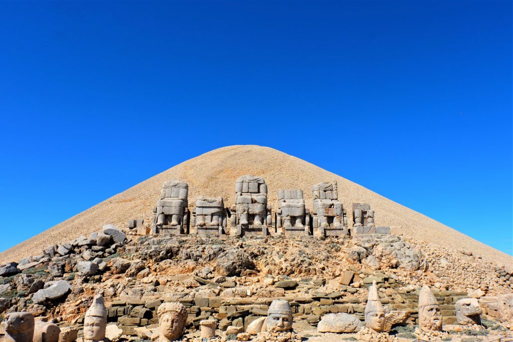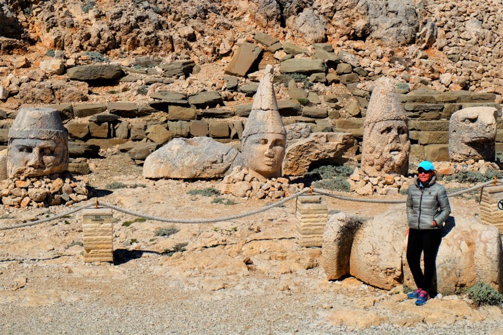 Wir erreichen den größten Grabhügel der Welt auf seiner Ostseite. Hier stehen sie, die Beschützer von König Antiochus, der vor zirka 2.100 Jahren dieses Werk hat erbauen lassen. Leider wurden auch sie im Laufe der Jahre durch Erdbeben zerstört. Doch ihre Magie haben sie dadurch nicht verloren.