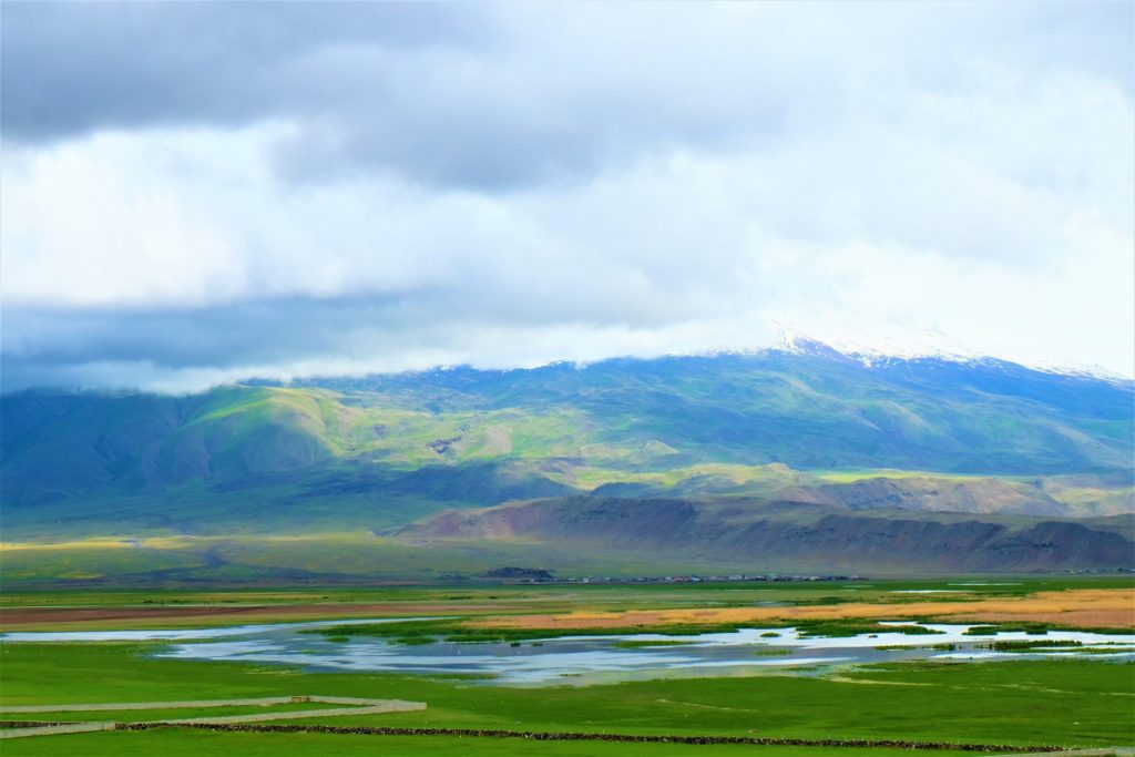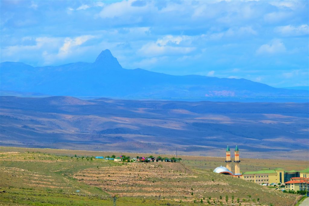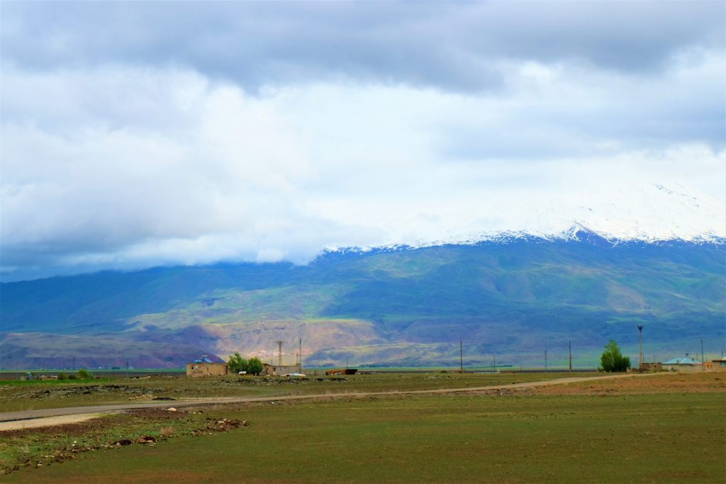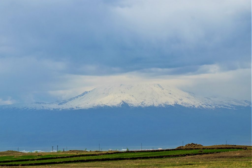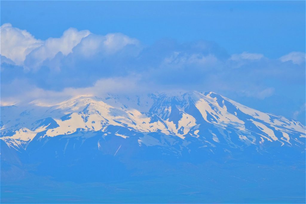 Dann sehen wir den mächtigen Berg der Berge auftauchen, der heute wie so oft sein schmuckes „Wolkenhäubchen“ trägt. Vor uns liegt der 5.167 Meter hohe Berg Ararat.
