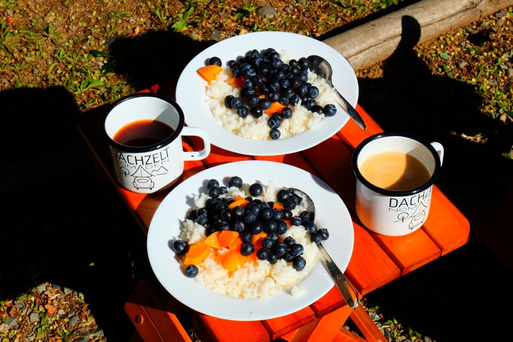 Etwas „Dachzelt“ ist immer dabei. Sportlerfrühstück vor der Kajak-Tour.