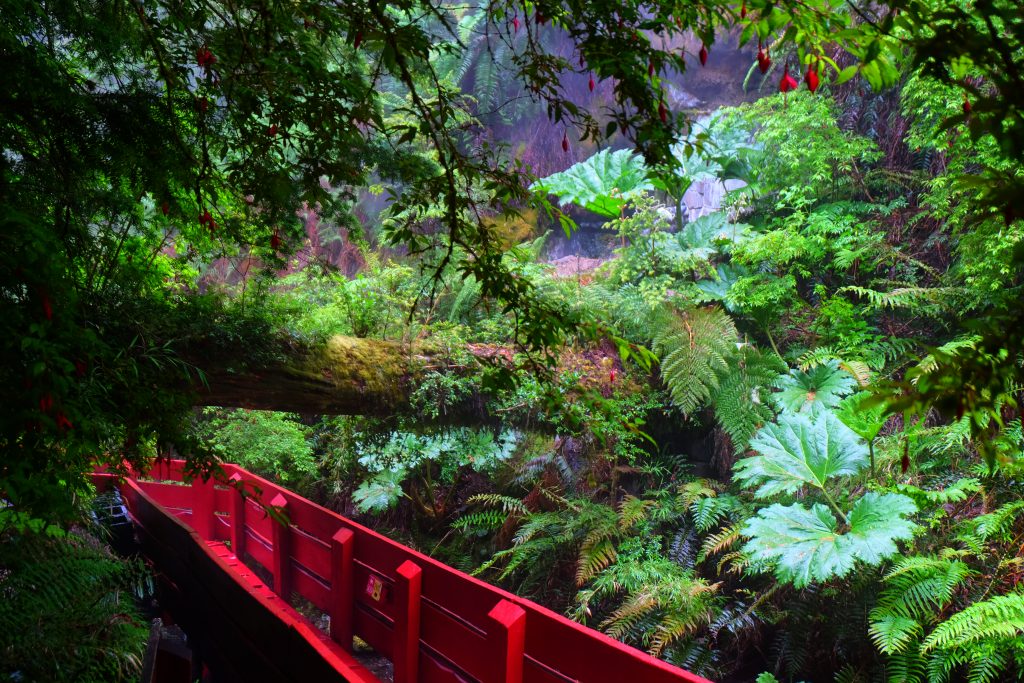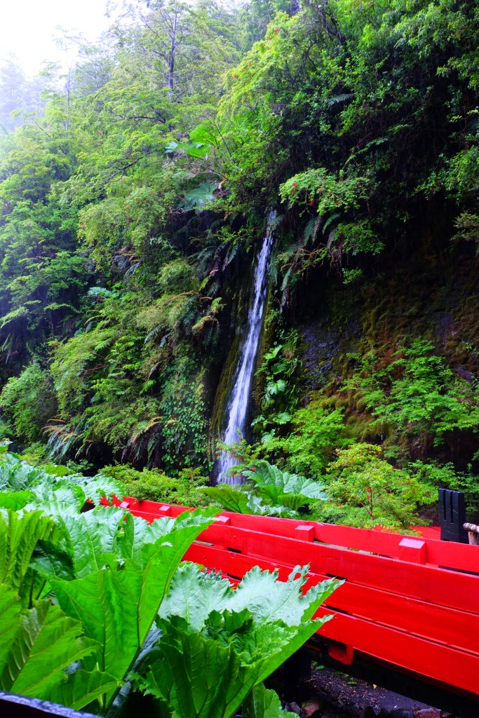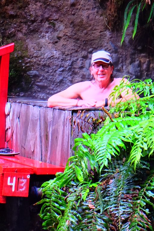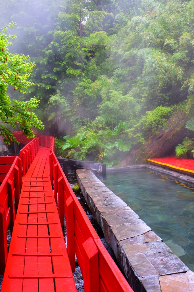 Das Wetter ist grau und regnerisch. Die ideale Voraussetzung, um zu den „Termas Geométricas“ zu fahren. Der chilenische Stararchitekt „Germán del Sol“ hat hier im Cajón Negro, einer engen Schlucht mit schwarzen Felsen und üppigem dichten grünen Dschungel, Wege von roten Holzstegen kreiert, die die einzelnen Becken miteinander verbinden. Die Termas speisen sich aus heißen Quellen, die aus dem vulkanischen Gestein entspringen. Für uns überraschend ist die Anwesenheit mehrerer chilenischer Familien einen Tag vor Heiligabend. Kein Einkaufsstress, kein Kochstress, kein „Was-zieh-ich-an-Stress“. Nichts. Nur Entspannung. Wir tauchen ein in Becken mit 39°C, 41°C und 43°C. Es ist eine mystische Atmosphäre inmitten der Natur in dampfenden Becken zu sitzen, während es mal mehr, mal weniger regnet. Herrlich angenehm und entspannend für den Geist und die Abenteurer-Knochen. Leider war kein „Jungbrunnen-Becken“ zu entdecken…