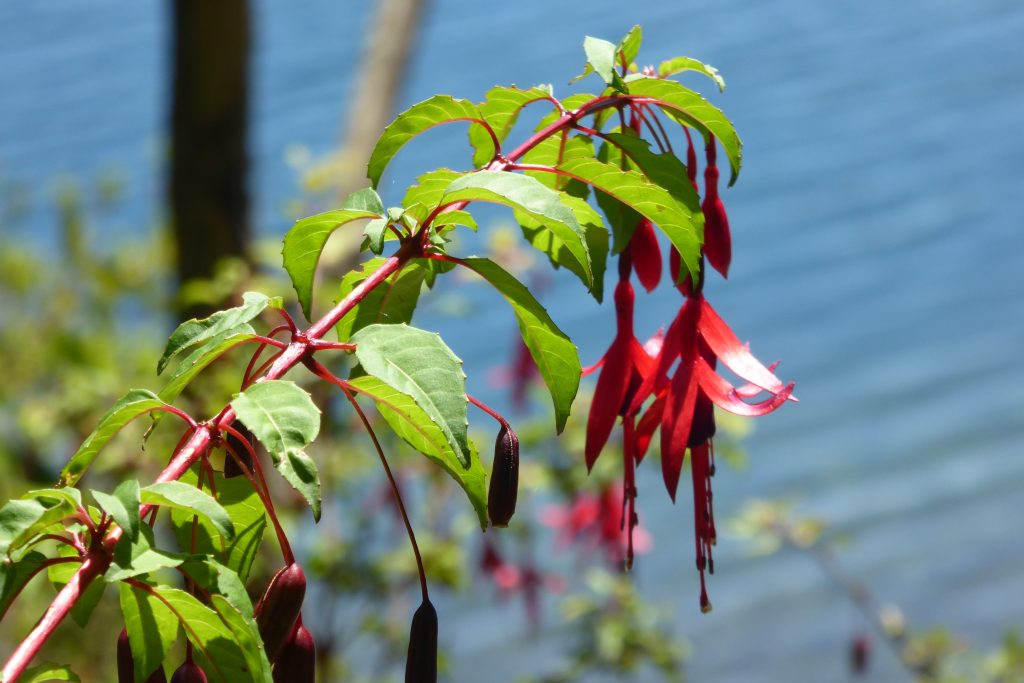 Wenn wir uns auf der Terrasse aufhalten, beobachten wir oftmals einen Kolibri, der die Blüten an den bis zu 3 (!) Meter hohen wilden Fuchsien besucht. Da der Bursche so flink ist, gebe ich nach dem 99. Versuch auf, ihn auf’s Foto zu bekommen. So verbleiben nur die Blüten.