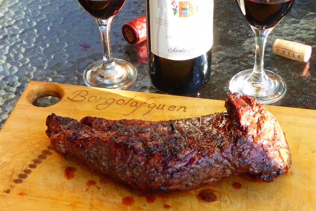 Wir tun es den Chilenen gleich und packen ebenfalls ein Stück Lomo vom Rind auf den Grill. Eigentlich müsste es „Stückchen“ heißen, da es lediglich 850 Gramm auf die Waage bringt. Der Metzger schaute etwas ungläubig und war total irritiert, als wir das kleinste Filet auswählen und kein weiteres dazu nehmen möchten. Normal rechnet der Chilene pro Person locker mindestens ein Kilo (!) Fleisch…