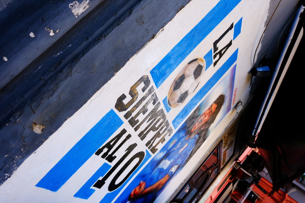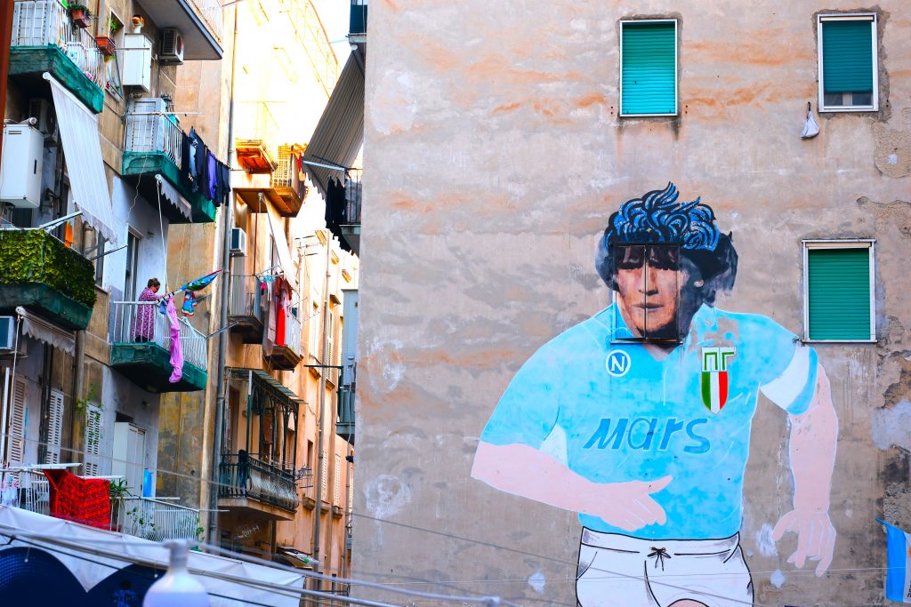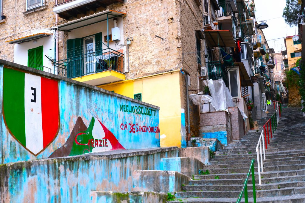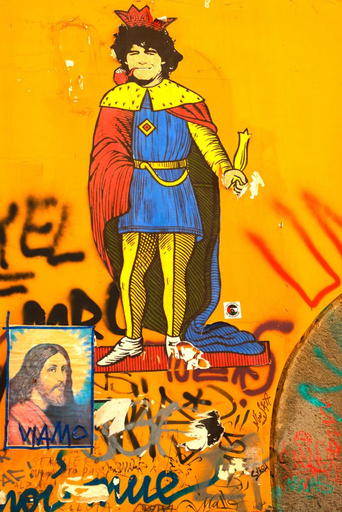 Kultort im Viertel ist seit langem der „Largo Maradona“, wo dem einstigen Spieler vom SSC Napoli durch ein großes Wandbild gehuldigt wird. Vermutlich sind von ihm in der ganzen Stadt weitaus mehr Wandmalereien und Graffiti zu finden, als in Buenos Aires. Okay, es ist mal wieder Zeit für einen kleinen Klugscheisser-Hinweis. Das Wort Graffiti ist eigentlich der Plural des aus der italienischen Sprache stammenden Worts Graffito und bezeichnete ursprünglich „eine in Stein geritzte Inschrift oder auch eine ornamentale bzw. figurale Dekoration“.