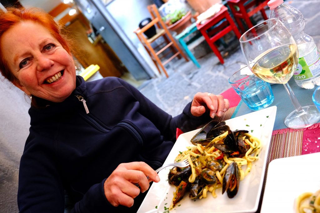 Fritturina di Calamari, Melanzane a Funghetti und Scialattelli Frutti di Mare sowie Greco Bicchiere genießen wir und stoßen auf Martina’s Wohl an. Salute!