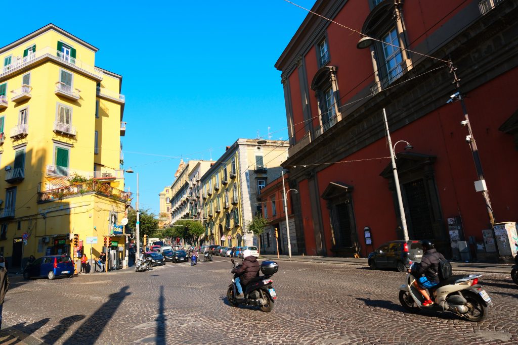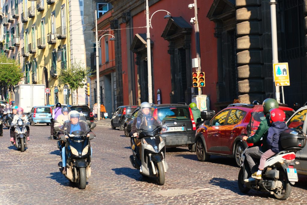 Gegen halb zehn Uhr landen wir in Napoli. Hey, was ist denn das? Frühlingshafte 16°C erwarten uns bei strahlend blauem Himmel und Sonnenschein. Mit dem Ali-Bus fahren wir zum Bahnhof. Metro-Wochenkarte kaufen und dann runter zur Station. Wir sind nicht alleine. Es ist sooo voll, dass wir wegen absolut vollgestopfter Bahnen schon mal zwei haben passieren lassen müssen. Dann drücken und quetschen wir uns in die nächste hinein. Das Gute: umfallen ist nicht möglich. Bei der Station „Museo“ fummeln wir uns schließlich wieder raus. Und der blaue Himmel ist wieder da, unter dem sich die Rollerfahrer ihr tägliches Rennen liefern.