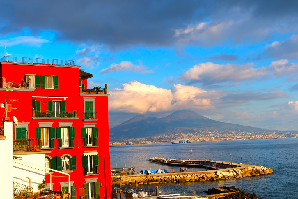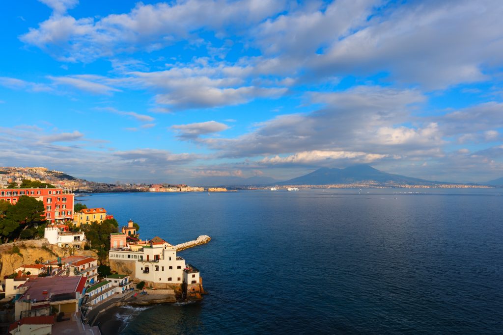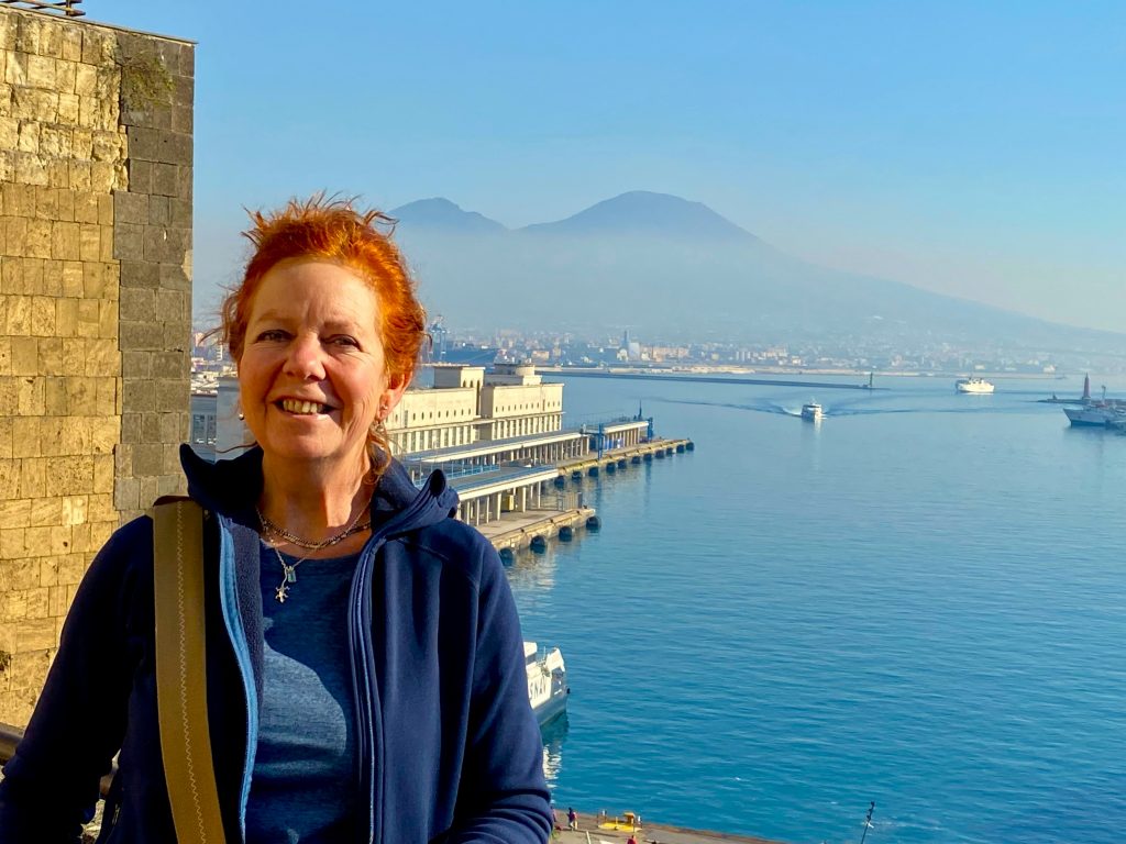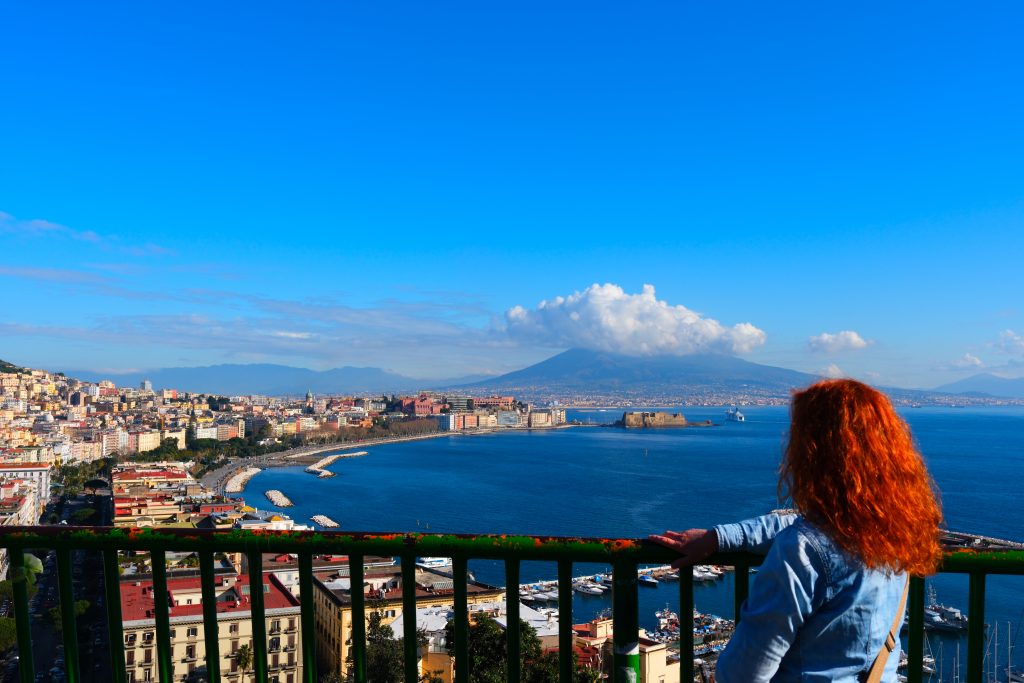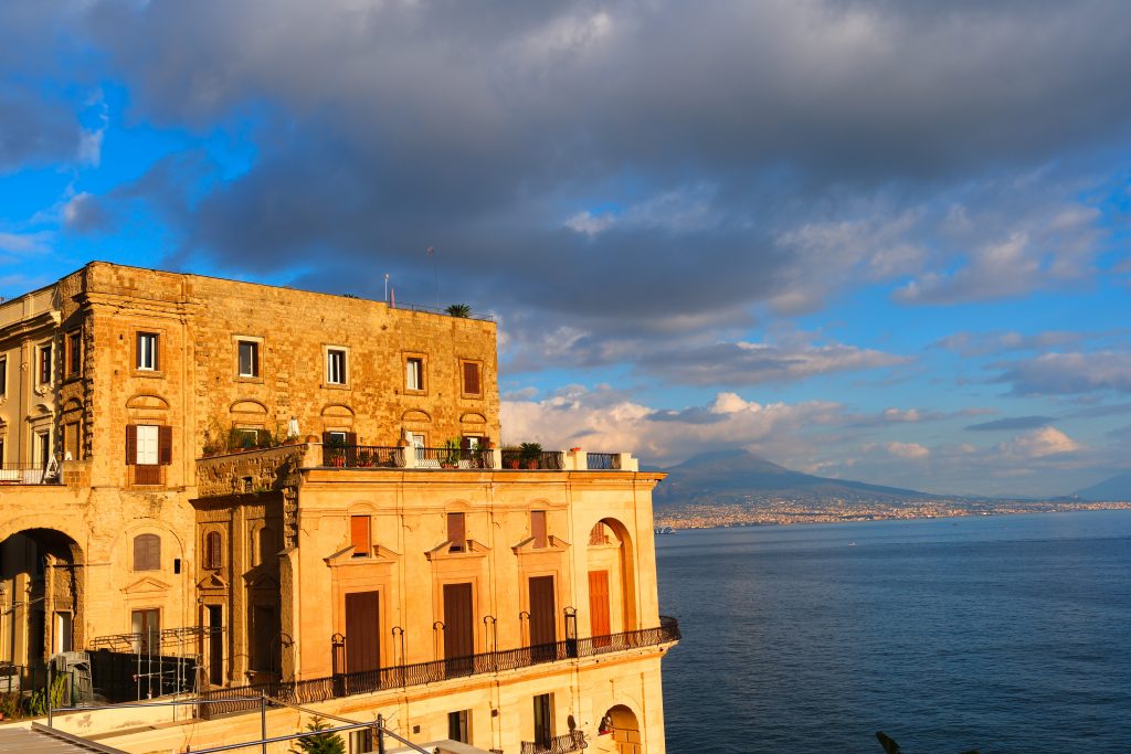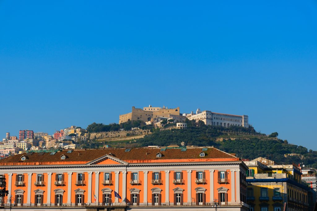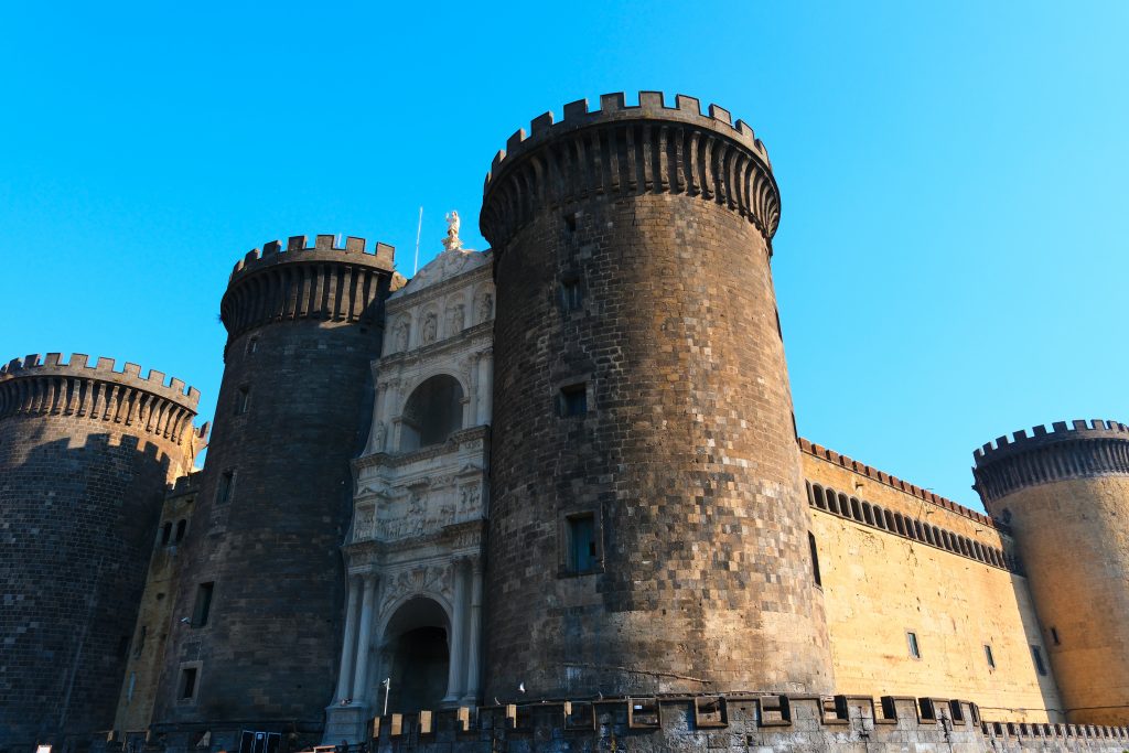 Von hier aus sind es dann nur wenige Meter bis zum „Nuovo Castel“, auch Maschio Angioino genannt, eines der bekanntesten Bauwerke der Stadt. Die Burg wurde seit dem Baubeginn 1279 mehrfach umgebaut und renoviert. Glücklicherweise ist die große Terrasse noch vorhanden. Von hier haben wir einen tollen Blick auf den Hafen und den alles überragenden Vesuv.