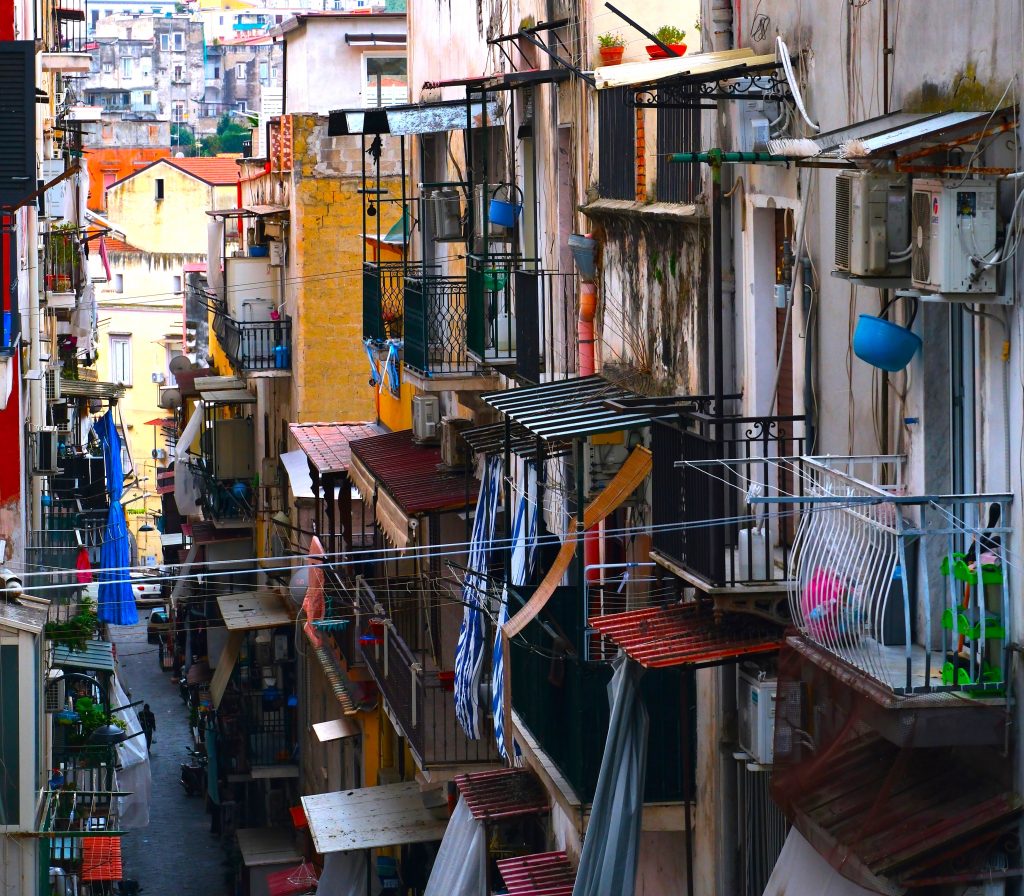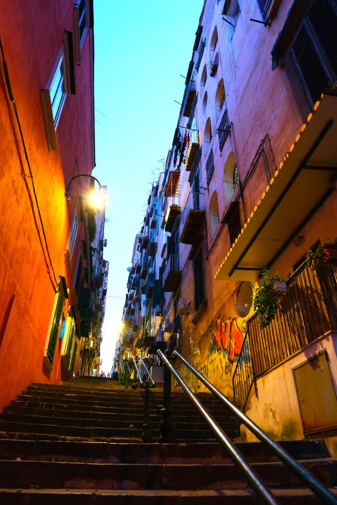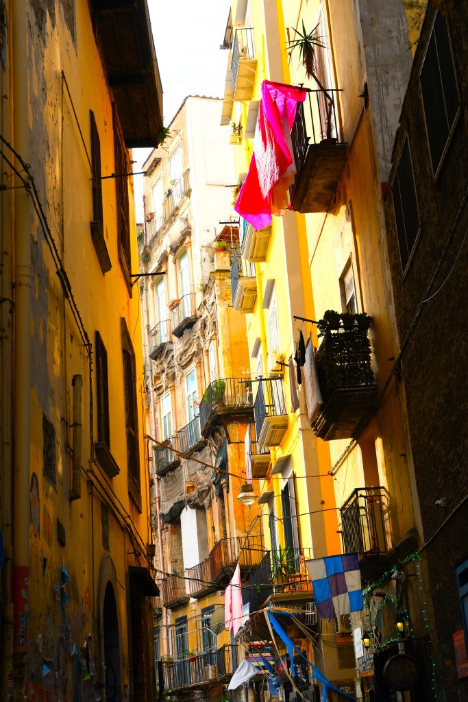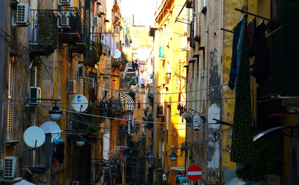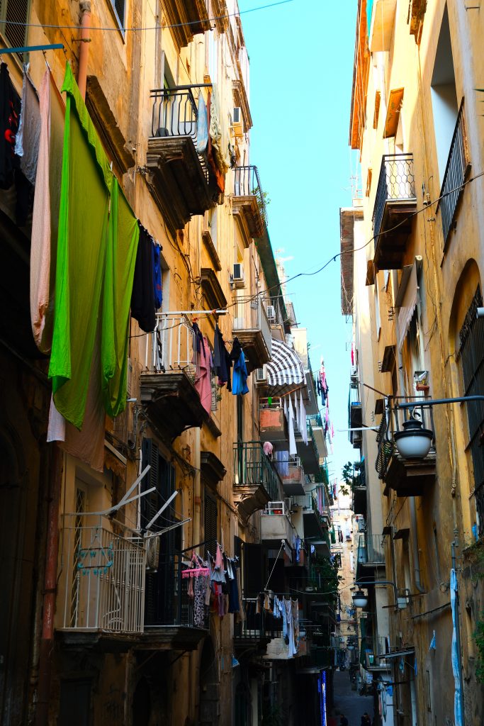 Über zahlreiche Stufen gehen wir direkt hinunter in das gefürchtete „Quartieri Spagnoli“. Was für ein Kontrast. Hier leben überwiegend wohl immer noch die Ärmsten der Armen in engen Gassen, in denen Satellitenschüsseln, wilde Kabelverbindungen und zu trocknende Wäsche das Bild prägen.