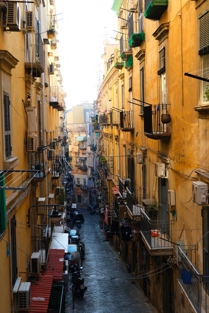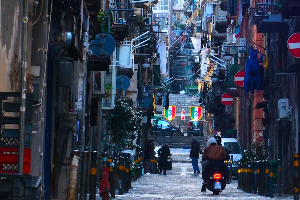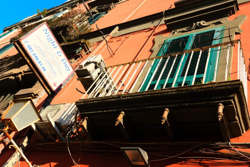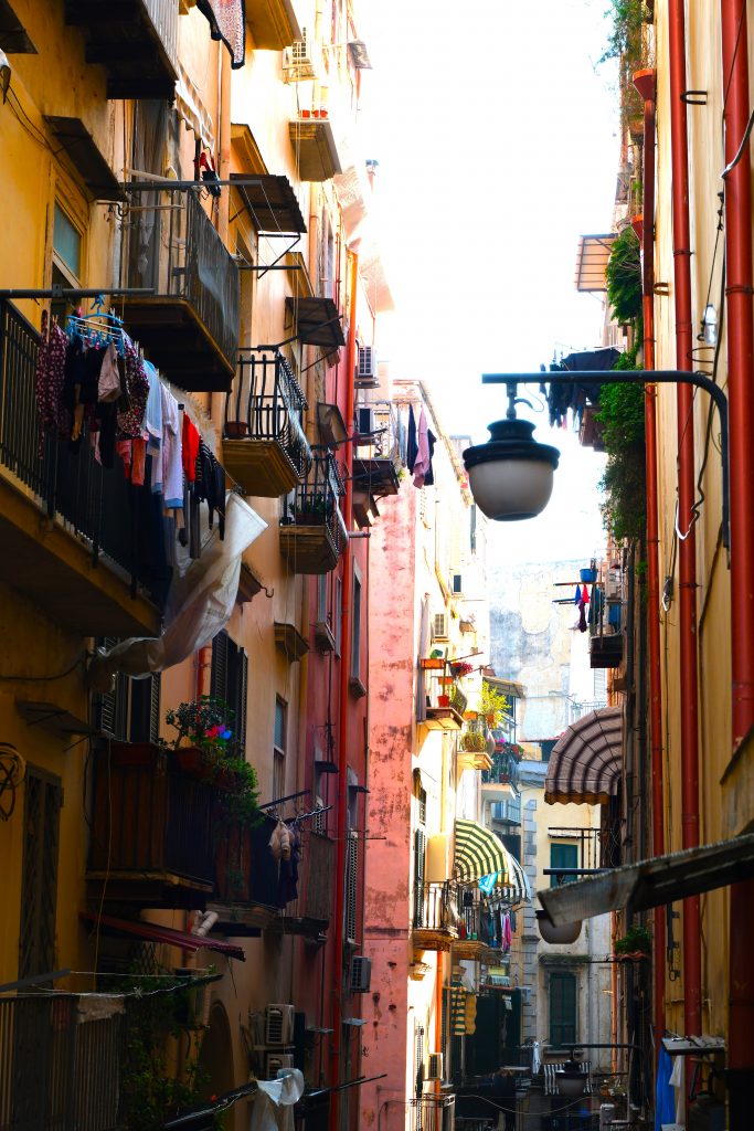 Über zahlreiche Stufen gehen wir direkt hinunter in das gefürchtete „Quartieri Spagnoli“. Was für ein Kontrast. Hier leben überwiegend wohl immer noch die Ärmsten der Armen in engen Gassen, in denen Satellitenschüsseln, wilde Kabelverbindungen und zu trocknende Wäsche das Bild prägen.