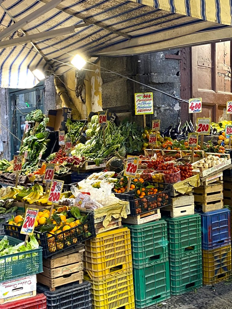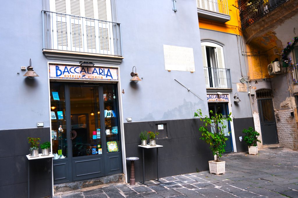 Schon überqueren wir die „Piazza del Gesù Nuovo“ mit dem „Obelisco dell’Immacolata“, dem Glockenturm und der mit Lavasteinen gebauten Kirche „Chiesa del Gesù Nuovo“, um ein paar Minuten später in der Piazzetta di Porto die „Osteria Baccalaria“ zu erreichen. Der Name des Lokals ist Programm. In allen Facetten wird hier Kabeljau zubereitet und serviert. Wir bestellen einmal die neapolitanische sowie die sizilianische Variante. Hauptsache scharf und rot. Dazu Grüngemüse als auch Gemüse vom Grill.