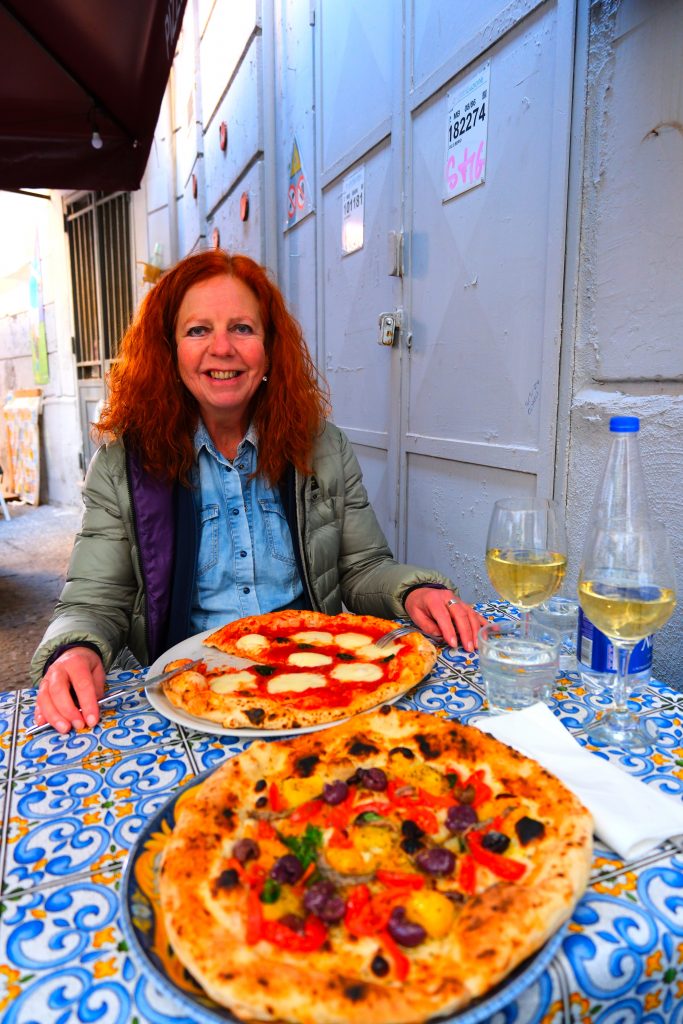 Jetzt ist es aber wirklich an der Zeit, unsere erste Pizza zu essen. Das machen wir bei „Augusteo“ in der Via Speranzella. Statt drinnen im Lokal sind wir lieber im improvisierten Außenbereich. Auf den Tisch kommen einmal die „Bufalina“ und einmal – und das ist nun wirklich ein „Muss“ – die „Napoli“.