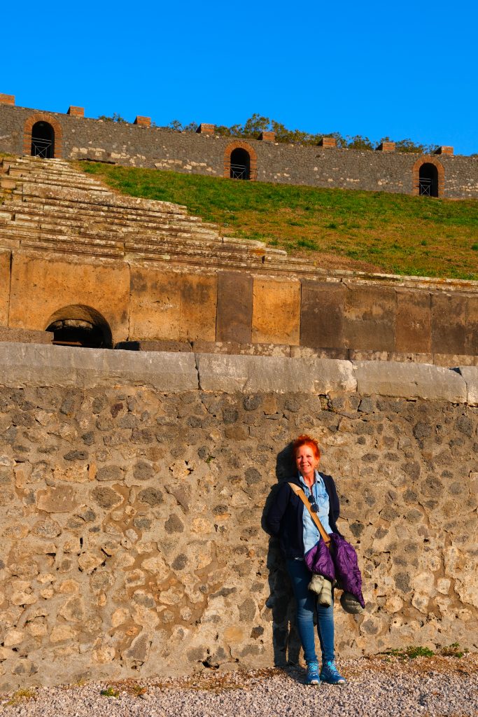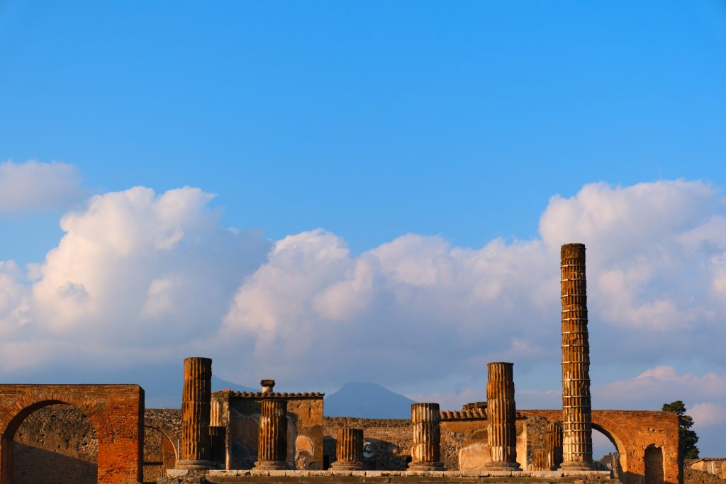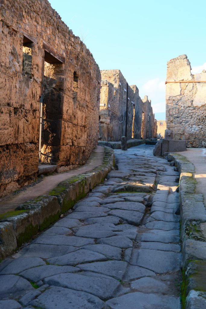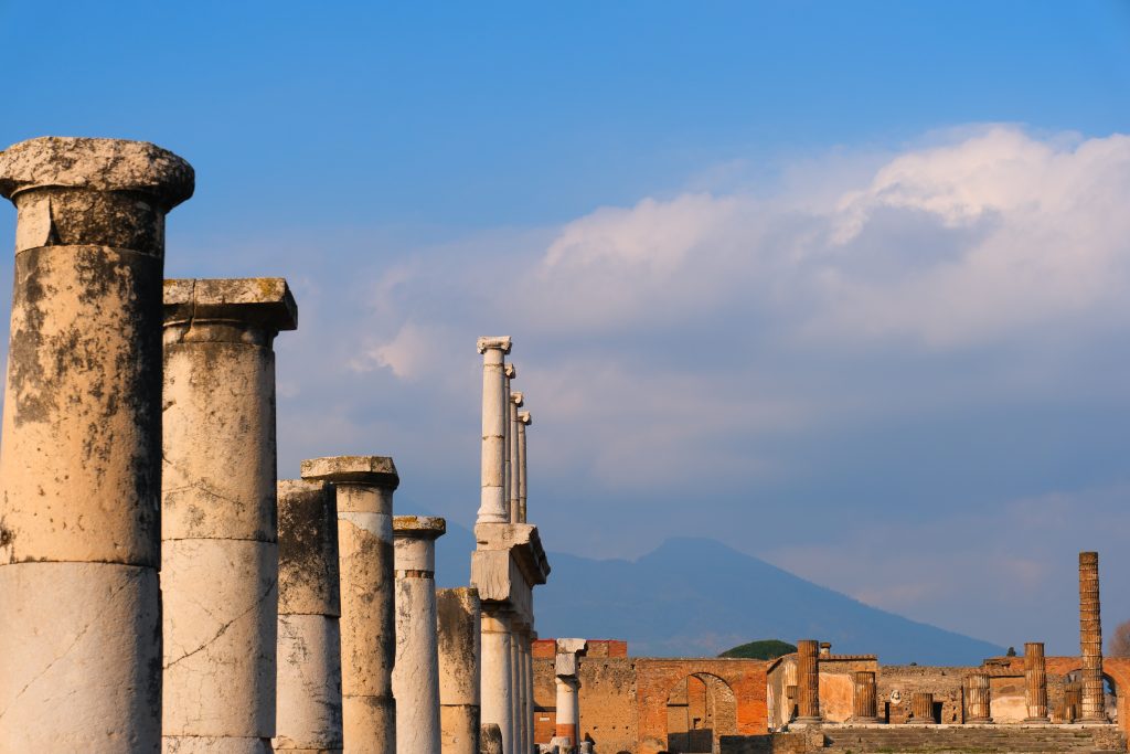 Jetzt nehmen wir erst einmal den Zug in Richtung der Küstenstadt „Sorrent“ auf der gleichnamigen Halbinsel. Dann regnet es plötzlich Asche vom Himmel und Glutlawinen aus heißen Gasen und Asche rasen die Vulkanflanken des Vesuvs hinab. Was ist denn das? Innerhalb kurzer Zeit wird die wohlhabende und kultivierte römische Stadt Pompeji unter einer mehrere Meter hohen Asche- und Bimsschicht begraben. Durchatmen, denn diese Katastrophe passierte bereits im Jahre 79 n. Chr. So können wir gefahrlos am Bahnhof der archiologischen Ausgrabungsstätte aussteigen.