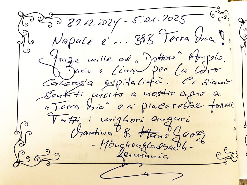 Es beginnt unser (vorerst) letzter Napoli-Abend. Wir nutzen die Chance und schreiben den „Terra Mias“ noch etwas Nettes in ihr Gästebuch.