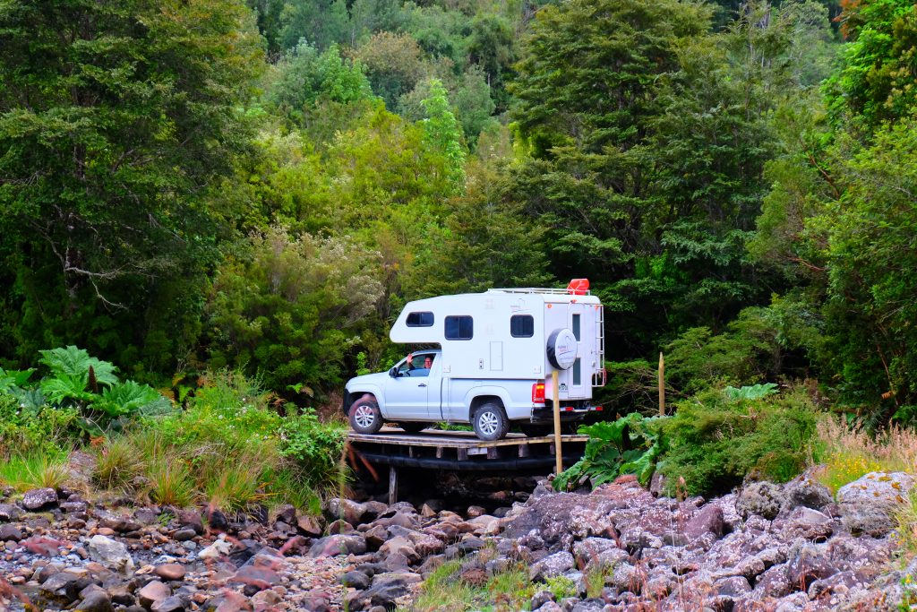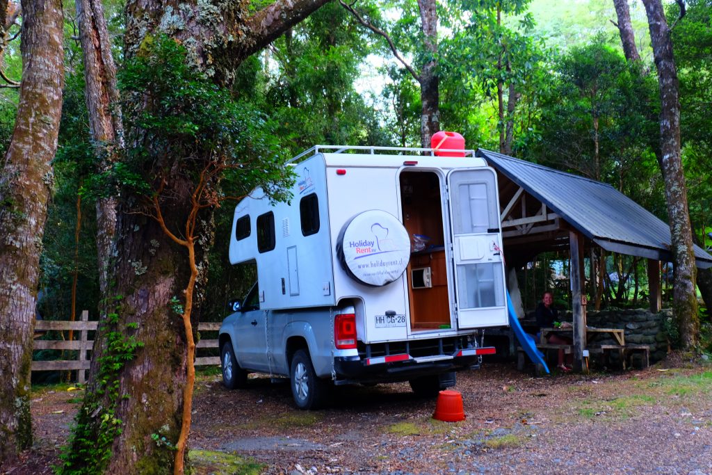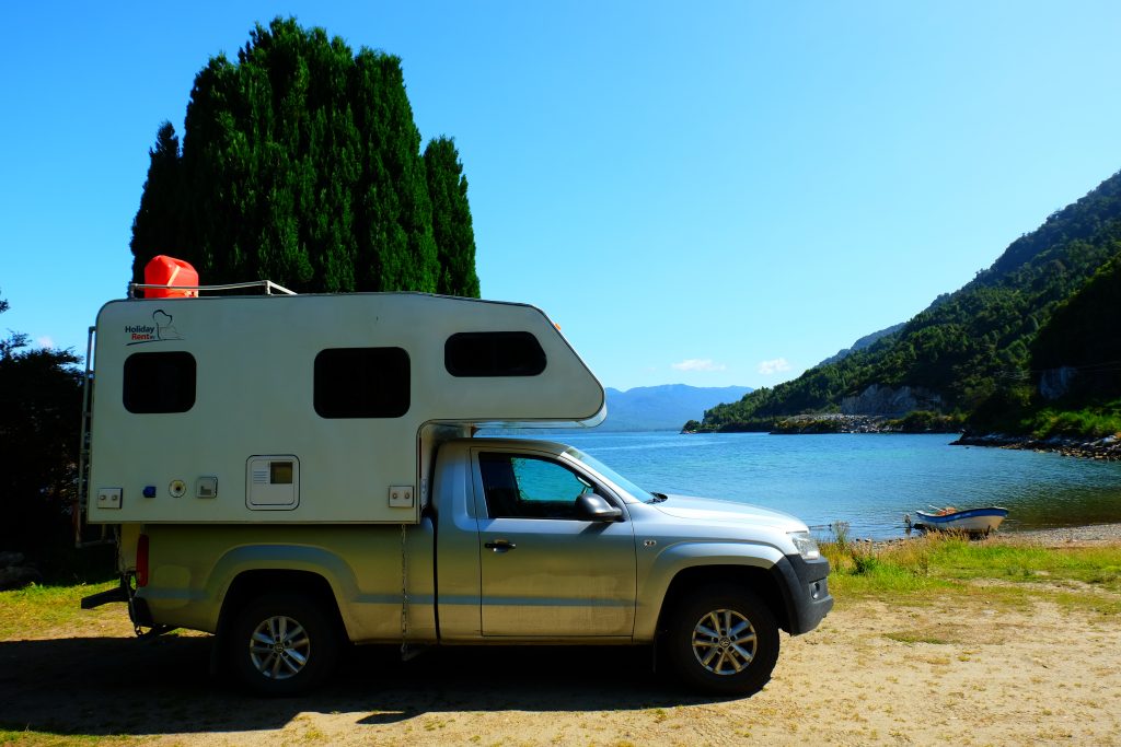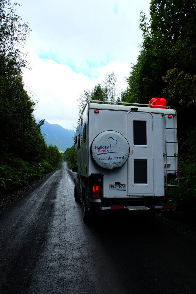 Von Puerto Varas fahren wir zum Hafenort Hornopirén. Das ist schon ein für uns ungewohntes Gefühl mit einer Wohnkabine „im Gepäck“ unterwegs zu sein. Erst einmal an die nicht vorhandene Rundumsicht gewöhnen. Das ein oder andere „Korrekturhupen“ der anderen Verkehrsteilnehmer hält uns auf dem rechten Weg… Die Strecke der Ruta 7, besser bekannt als Carretera Austral und mit vielen Mythen umschrieben, beinhaltet bereits zu Anfang eine kurze Fährfahrt zwischen La Arena und Puelche. Ein Vorgefühl für den morgigen Tag. Das Eco-Camp liegt versteckt am Rande des Ortes und ist schon ziemlich „rustico“. Wir stehen direkt am Wasser in absoluter Ruhe. Nachts kommt Regen und Wind auf. Ein erster Test für die Fensterdichtungen, die dem nur bedingt standhalten. Schon kommt das Panzertape zum Einsatz…