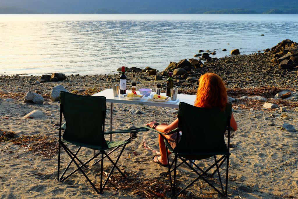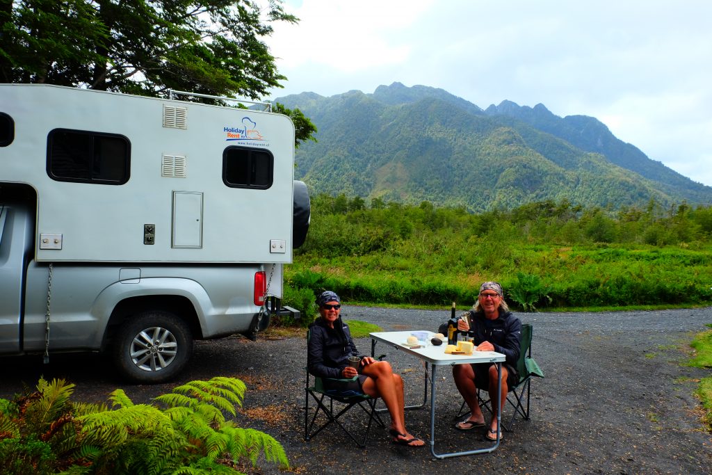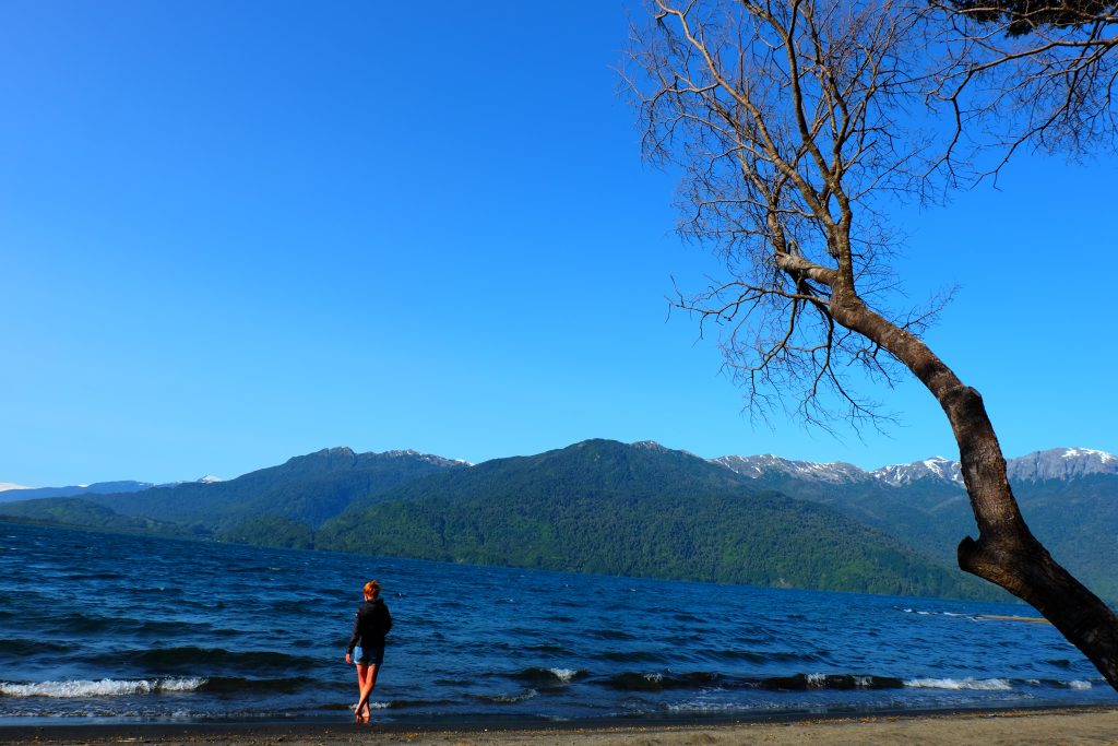 Über die Carretera Austral erreichen wir nach knapp 40 Kilometern bereits unseren nächsten Stellplatz direkt am See gelegen. Wir bekommen es nicht hin, den Wagen einigermaßen waagerecht zu stellen. Und so müssen wir uns entscheiden: rote Birne oder rote Socken…