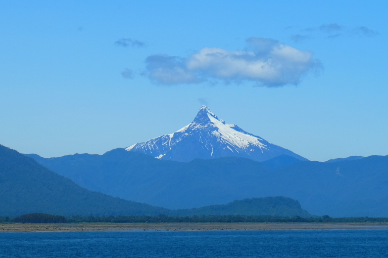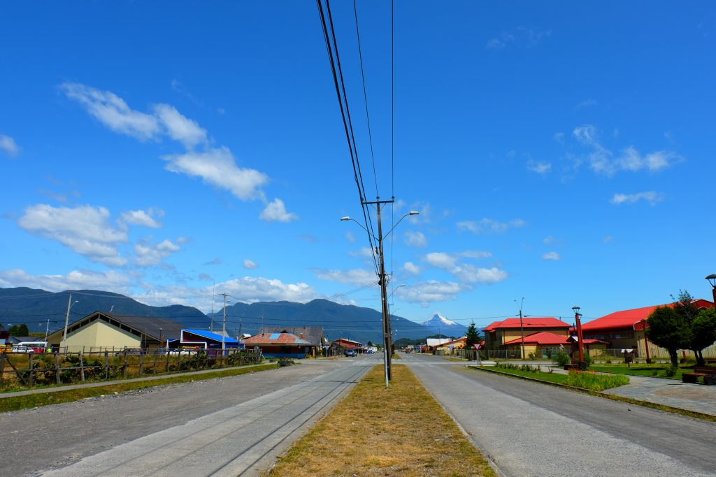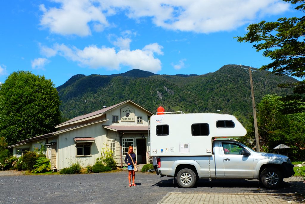 Von der Strecke sehen wir den 2.300 Meter hohen Vulkan Corcovado. Bald darauf erreichen wir den neu aufgebauten Ort Chaitén und dann den Mercado Puma Verde, wo wir jeweils für die nächsten Tage neue Vorräte einkaufen.
