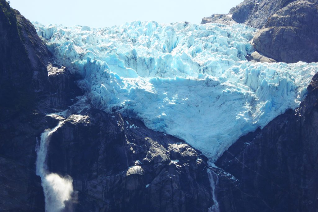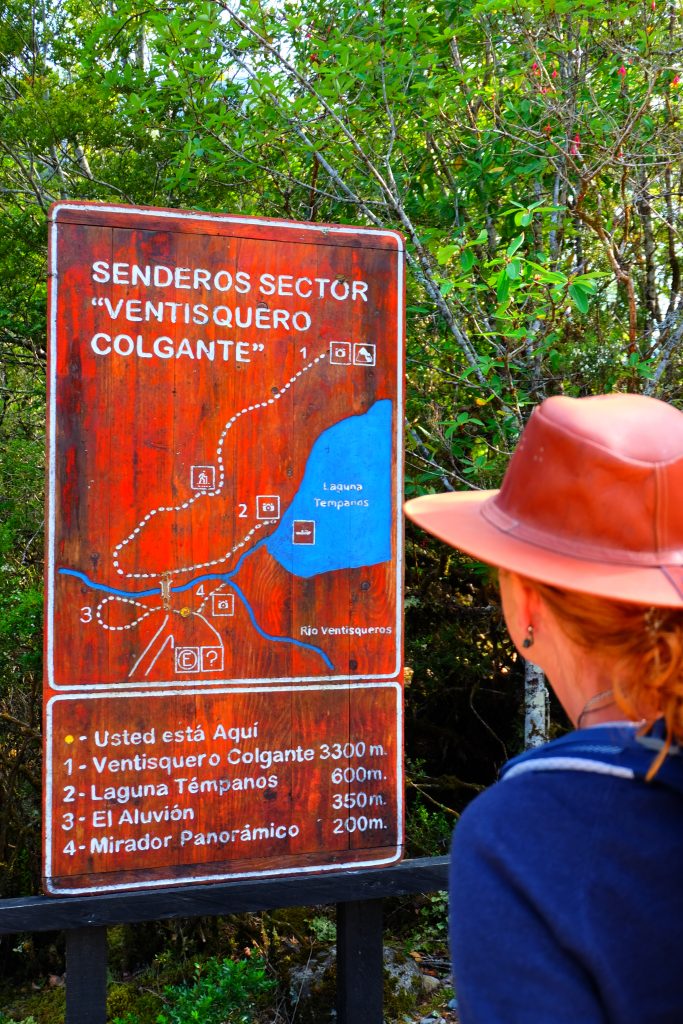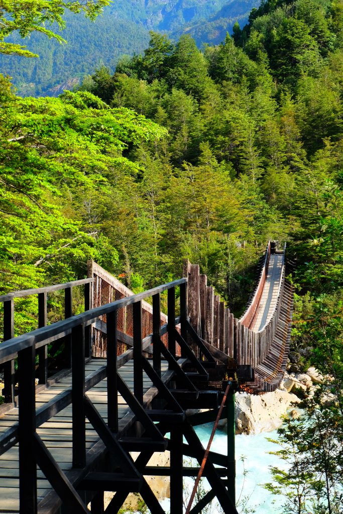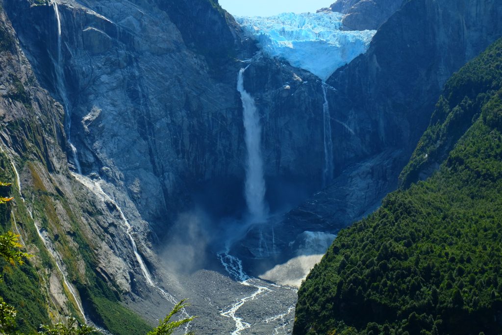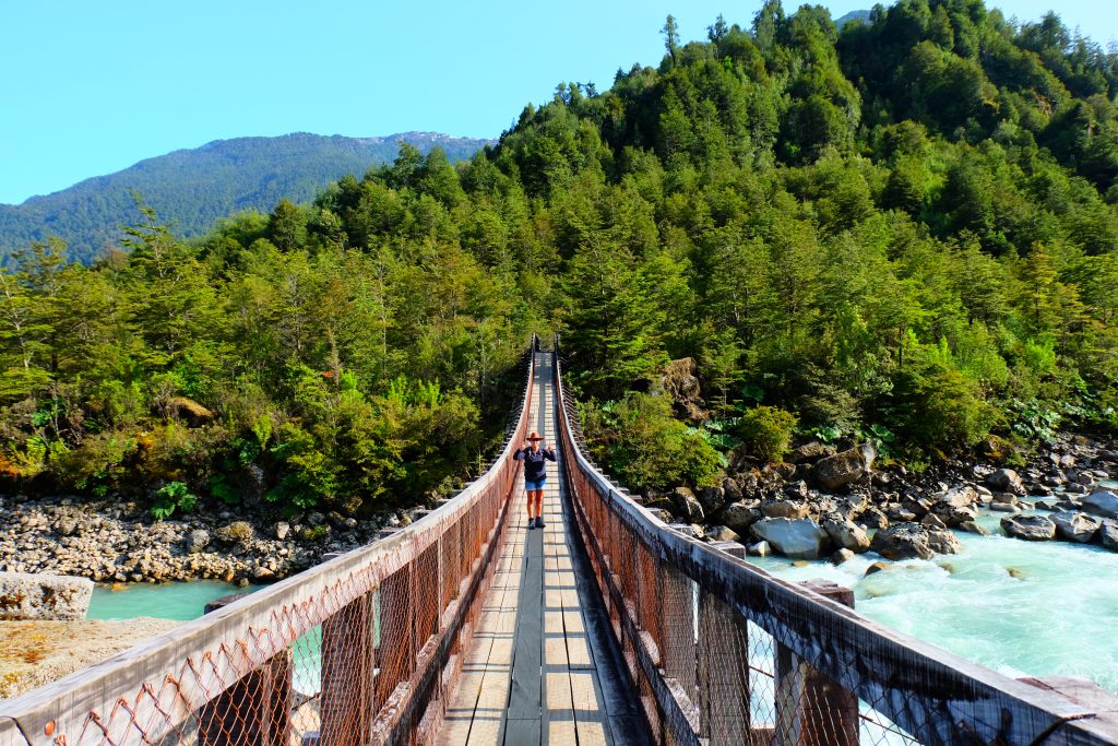 Nur wenige Minuten entfernt, ist der Ausgangspunkt für die Wanderung zum Ventisquero Colgante, dem „hängenden Gletscher“, im Parque Nacional Queulat. Bereits nach ein paar Metern führt der Weg über eine Hängebrücke, die den Rio Ventisquero überspannt. Danach geht es über Stock und Stein zwei Stunden recht steil hinauf zum Mirador. Doch die Anstrengung lohnt sich!