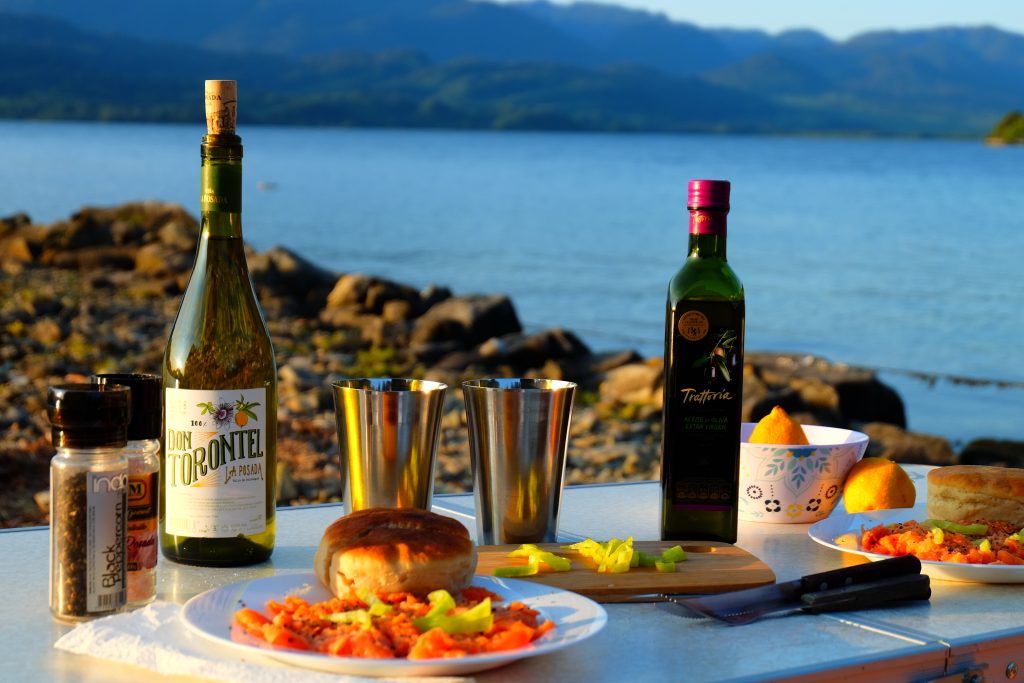Bis zur unserer nächsten Zwischenstation sind es gute 150 Kilometer. Erneut fahren wir durch grandiose Landschaften, die uns immer wieder staunen lassen. Im Ort Puyuhuapi ist gerade Volksfest. Alle Bewohner treffen sich am Wasser zum Asado. Kaum sind wir da, werden wir auch schon angesprochen, doch am Fest teilzunehmen. Würden wir gerne, doch uns ist heute nach Fisch. Und so kehren wir stattdessen im Lokal „El Muelle“ ein und bestellen Congrio con Curry y Arroz. Wenig später erreichen wir unseren Stellplatz direkt am Fjord. Für uns spontan einer unserer Lieblingsplätze.