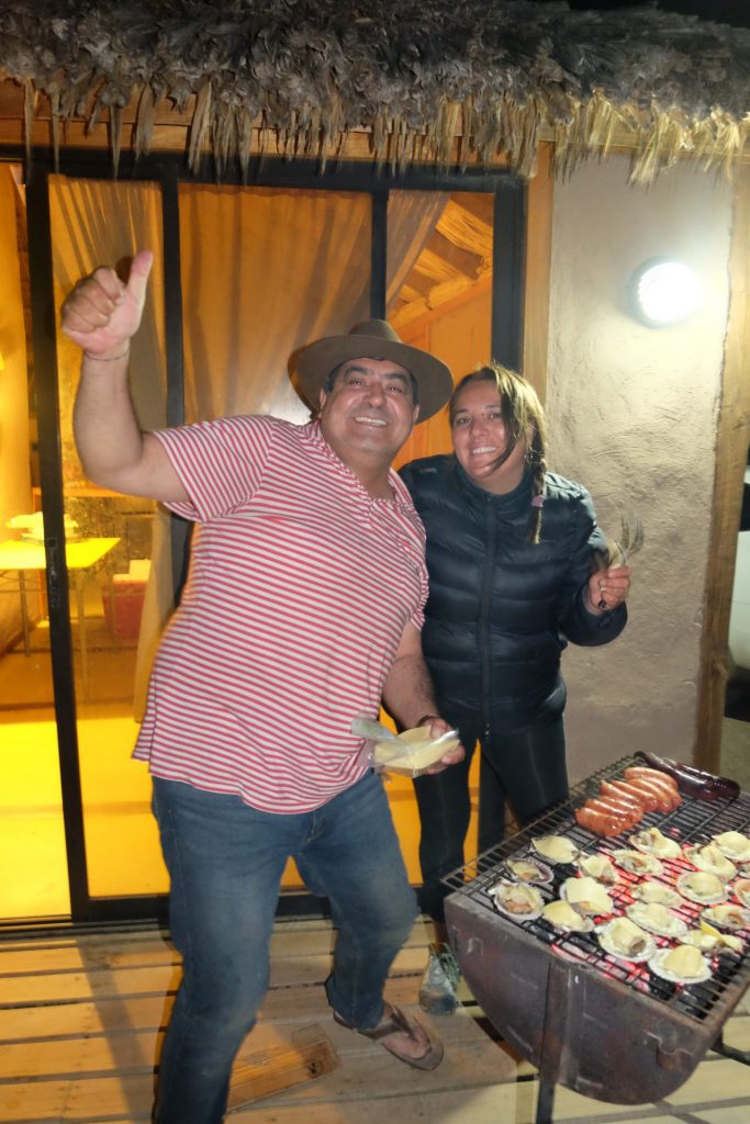 Wir halten uns weiter auf der Wüstenstraße Richtung Norden, obwohl wir wieder am Meer landen. Martina hat eine schöne Cabaña ausfindig gemacht. Ein kleines Haus im Nationalpark Pan de Azucar mit warmen Duschen und einem fantastischen Blick auf den Pazifik. Pelikane und Geier mit knallrotem Kopf und Schnabel fliegen scharenweise (!) durch die Lüfte. In der Nachbar-Cabaña hat sich ein chilenisches Paar einquartiert. Wenige Augenblicke später sind wir bei Gustavo und Andrea zum Grillen eingeladen! Jakobsmuscheln, Chorizo, Blutwurst, Schweinefleisch und Lomo vom Rind wird auf einem Strandgut-Holzbrett serviert. Jeder greift zu, bis man kurz vor dem Platzen ist. Ablehnen ist halt unfreundlich…