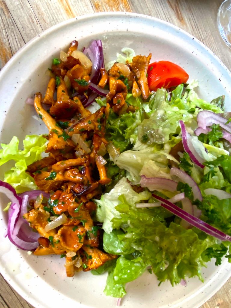 Wir verkosten tatsächlich einen „Weltmeister-Wein“. Kein Witz. Mit diesem lebendigen, jungen, prickelnden, erfrischenden, perlenden, spritzigen, frischen, frechen und beschwingten Gutedel, hat das Weingut diesen Titel erhalten. Dazu passt ein frischer Salat mit Pfifferlingen.