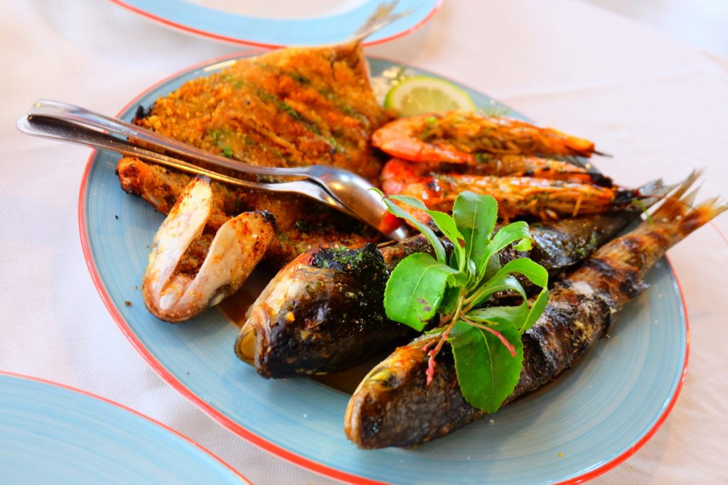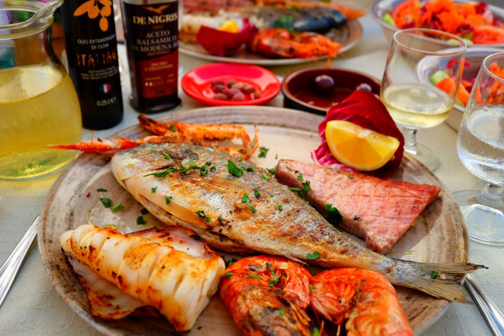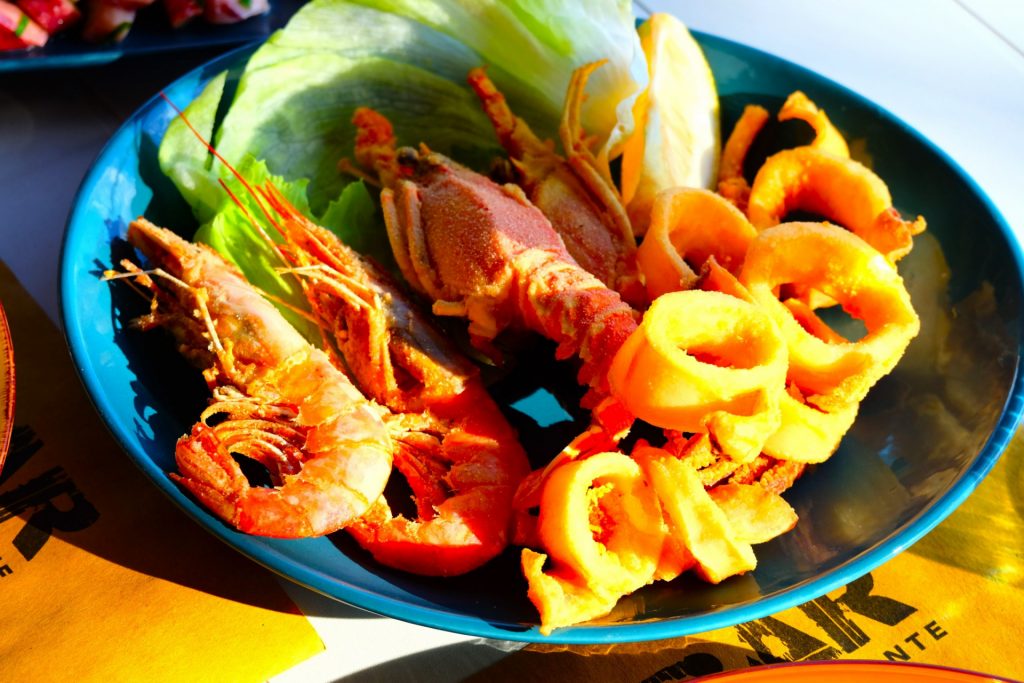 Und was ist direkt nebenan? „Il Ghiottone“, der Vielfraß. Da wird nicht lange überlegt, denn hier sind wir richtig 😉 Und schwups sind die beiden Teller mit je einer Kombination von einer Dorade, einem Tintenfisch, einem Thunfischsteak sowie Krebsscheren und zwei Garnelen serviert. Ist das lecker!