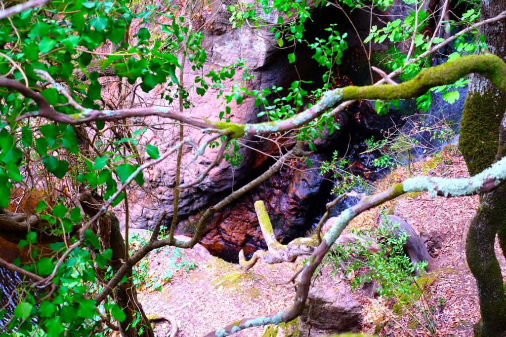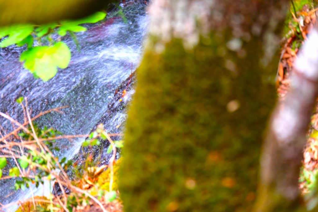 Am nächsten Tag wandern wir zu einem kleinen Wasserfall, der versteckt im Wald liegt. Ein direkter Zugang ist nicht möglich, so bleibt uns nur der Blick durchs Geäst von schrägoben.