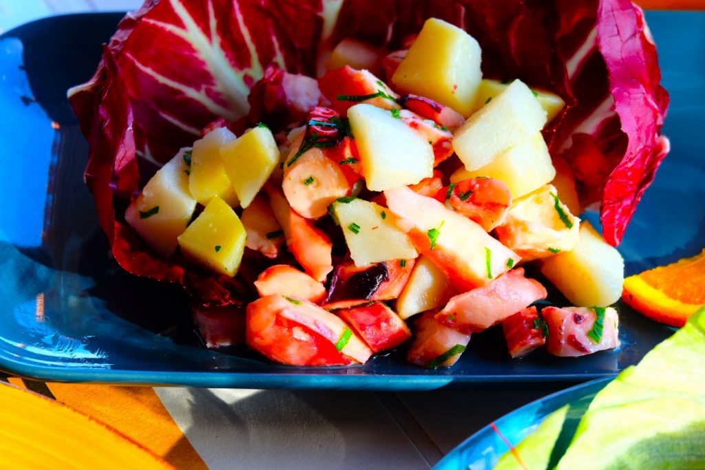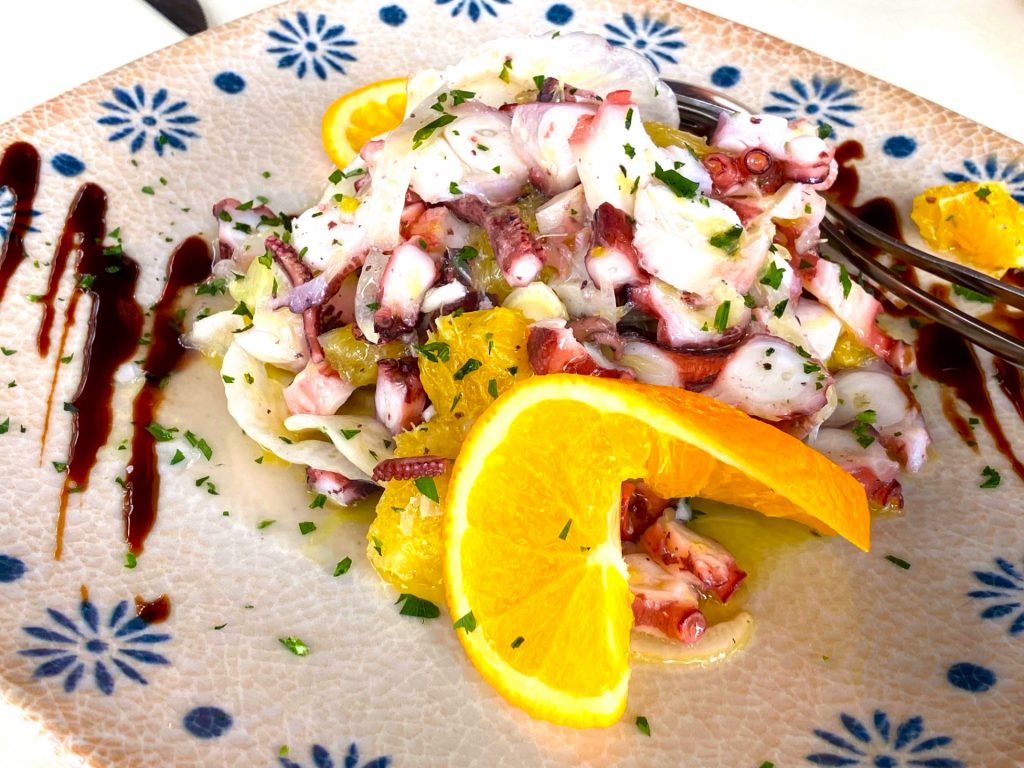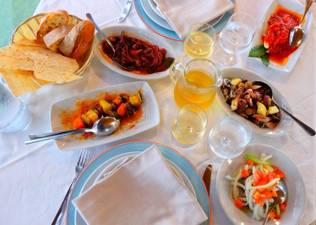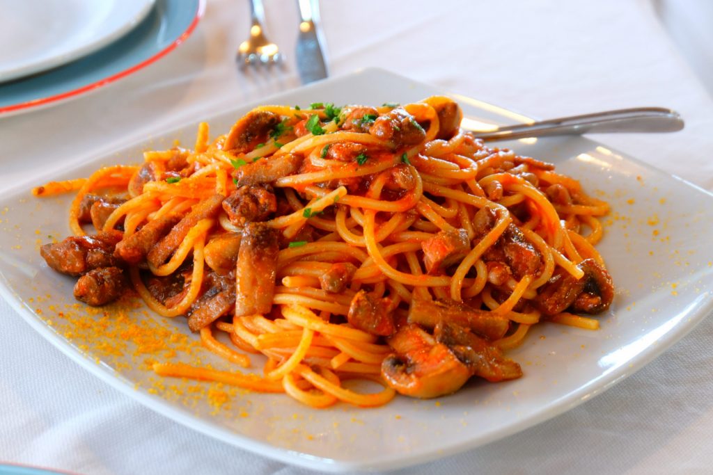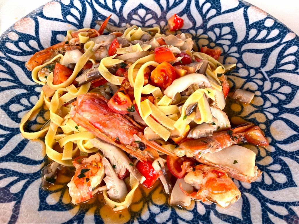 Geben wir uns den kulinarischen Sinnen dieses Menüs hin. Zuerst die Antipasti: Insalate di Polpo, Moscaroini alla Diavola, Scambecciu di Muggine, Spiedini Pontis, Tonno con Sedano, Cipolle e Pomodorini. Es folgt der Primi-Gang: Spaghetti al Ragu di Tonno e Funghi.