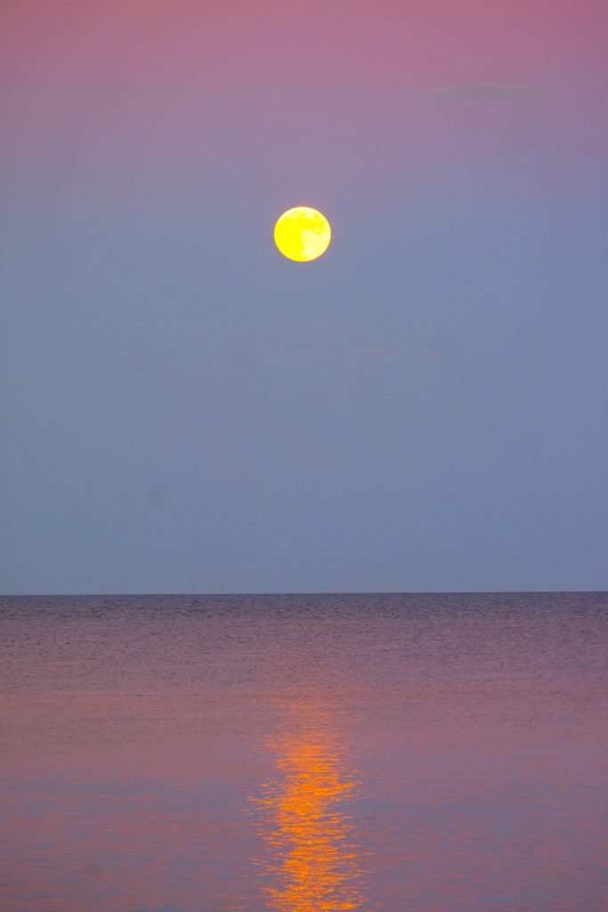 Es ist Vollmond, der gemeinsam mit der bereits untergegangenen Sonne für eine atmosphärische Stimmung über dem Meer sorgt.