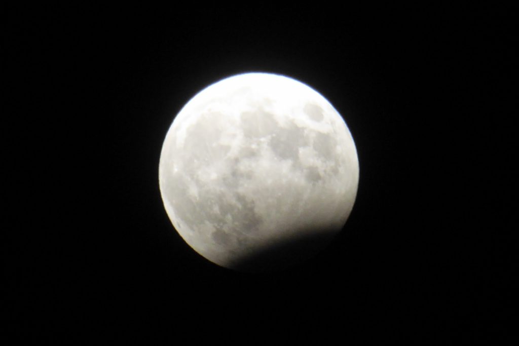 Heute ist sogar ein ganz besonderer Vollmond. Ab 21.35 Uhr beginnt eine partielle Mondfinsternis, da die Mondscheibe von rechts nach links in den oberen Rand des Kernschattens der Erde eintaucht. Schon um 22.15 Uhr ist die Bedeckung maximal und die Mondscheibe sieht aus, als wenn sie unten etwas angeknabbert wäre. Um kurz vor 23 Uhr ist die Party dann wieder vorbei.