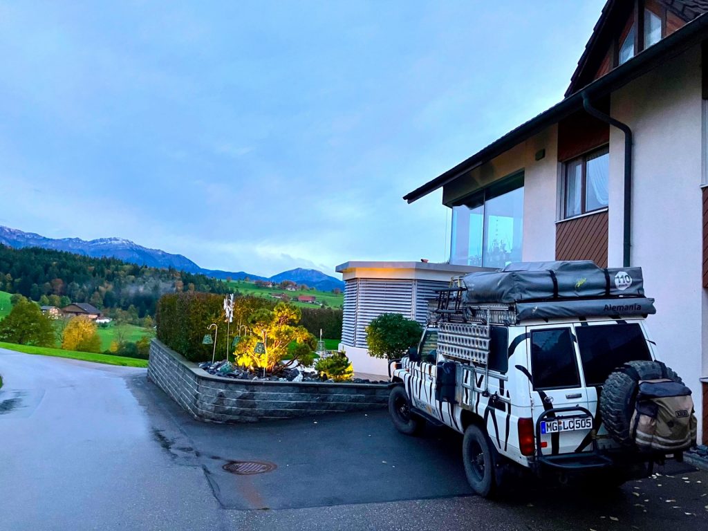 Nach einer ruhigen Überfahrt kommen wir morgens in Livorno an. Noch ist es trocken, doch es ist Regen gemeldet. Ab Milano schüttet es dann ohne Pause während der gesamten Strecke. Nur die 17 Kilometer im Gotthard Tunnel sind trocken 😉 Wegen des schlechten Wetters und kalten 7°C haben wir uns ein kleines Apartment bei „Mäggi“ im Ort Sigigen in der Schweiz gemietet. Sehr gemütlich mit tollem Blick auf den bereits schneebedeckten Hausberg Pilatus.