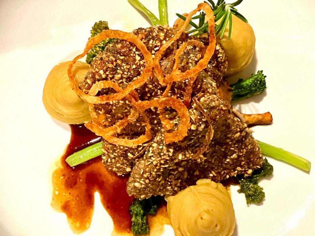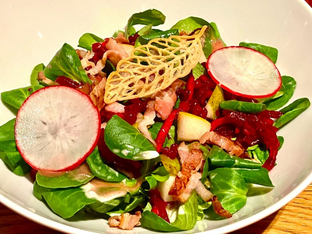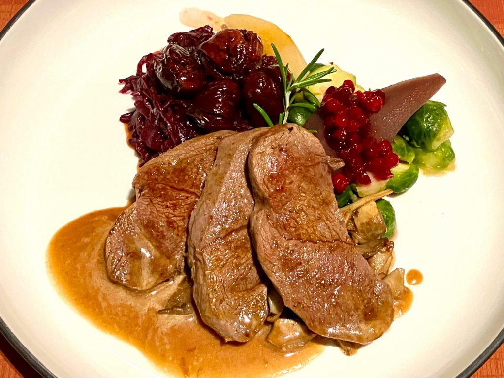 Wir starten mit dem Salat „Herbstliche Nüsslis“, wobei hier keine Nüsse gemeint sind, sondern Feldsalat. Als Hauptgericht wählt Martina „Kalbsfilet mit Kürbis-Kartoffelmousse und grünem Gemüse“, ich entscheide mich für „Rehfilet mit Spätzle, Rotkohl mit Maronen sowie Rosenkohl“. Was für ein Genuss!