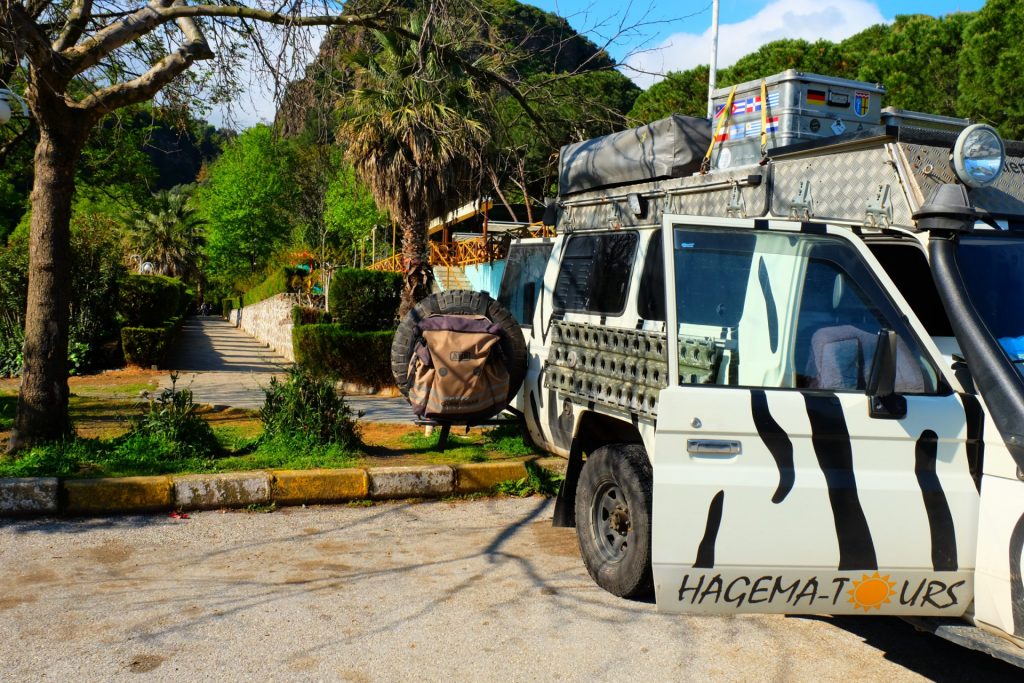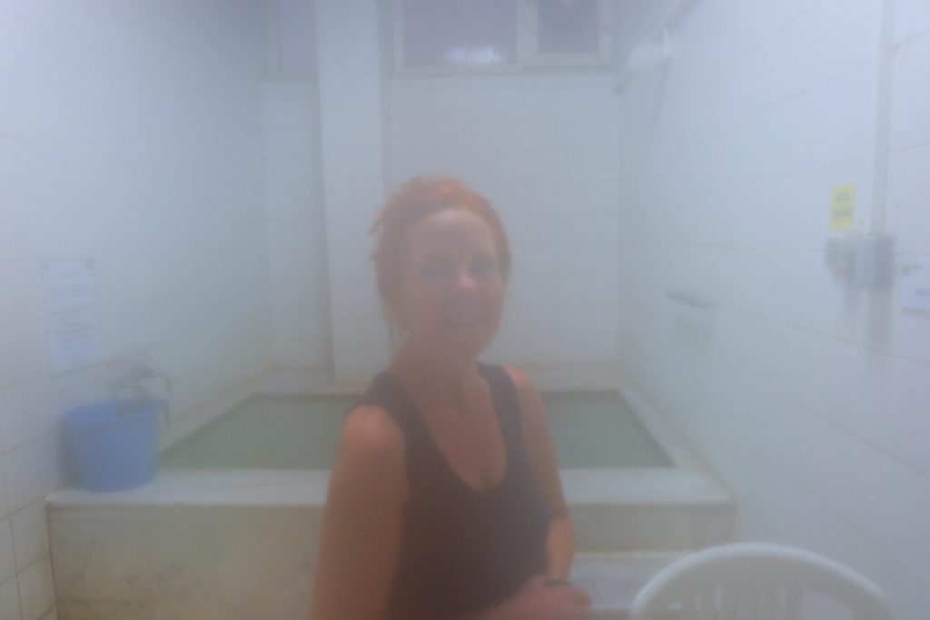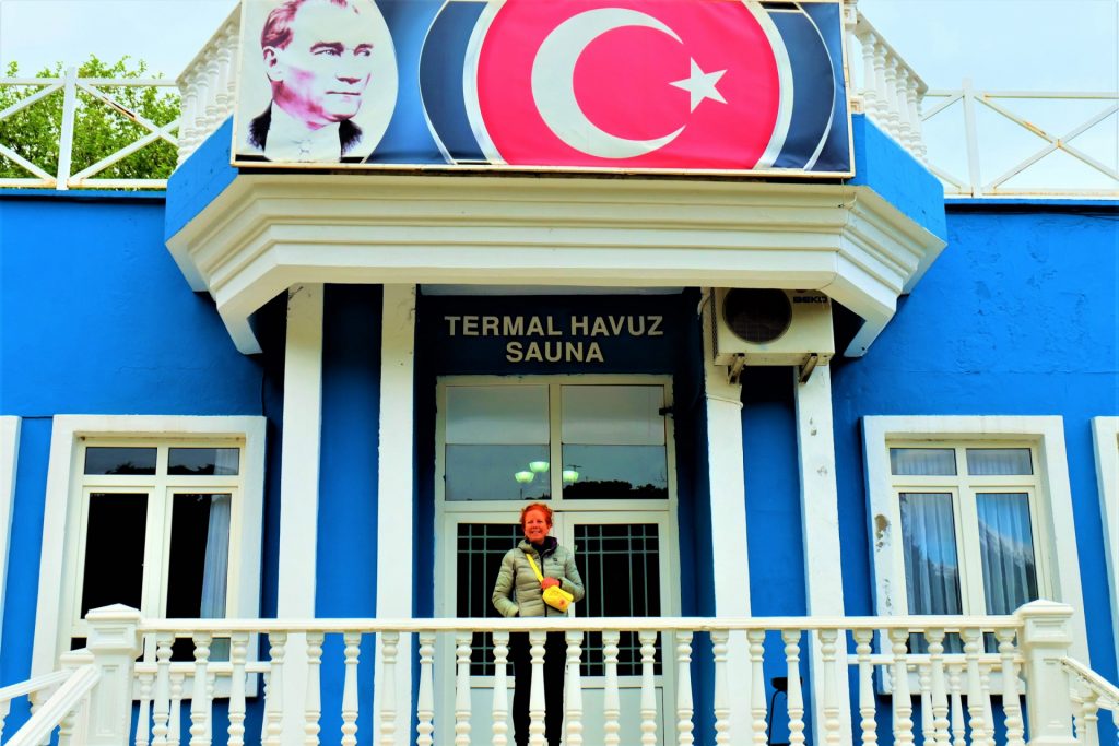 Dann ist es wieder trocken und wir steuern den Artemis-Tempel in Sardes an und fragen, ob wir hier auf dem Parkplatz übernachten können. Können wir nicht. Ein Busfahrer, der gerade Besucher zum Tempel gefahren hat, bekommt unsere Frage mit und sagt, wir können doch zum „Thermalbad Kurşunlu“ fahren. Da ist es möglich. Und so ist es dann auch. Und wenn wir schon mal da sind, steigen wir in das Becken mit von 55 Grad aus der Erde kommendem und auf 40 Grad „herunter gekühltem“ mineralischem Wasser …