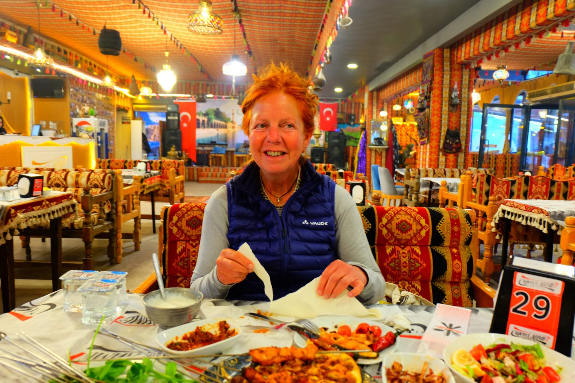 Ein Glücksgriff dagegen ist das Restaurant Cigerci Ahmet. Wir tauchen ein in die Genüsse der anatolischen Küche und bestellen „Kuzu Şiş“ und „Harran Tavuk“. Den Nachtisch bekommen wir von einer türkischen Familie ausgegeben, die am Nachbartisch sitzt. Was sagt man dazu?! Und es kommt noch besser: Beim Herausgehen nimmt die Frau ein Armbändchen bei sich ab und legt es Martina freudestrahlend an. Unglaublich, oder?!