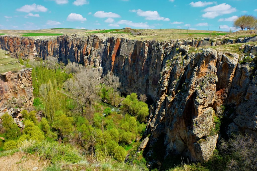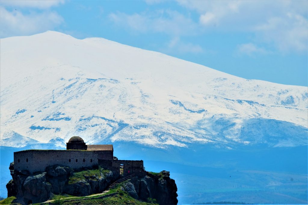 Unser weiterer Weg macht Spaß und führt zur „Yüksek Kilise“, einer freistehenden „hohen Kirche“ in der Nähe des Ortes Güzelyurt und imposant vor den schneebedeckten Bergen gelegen.