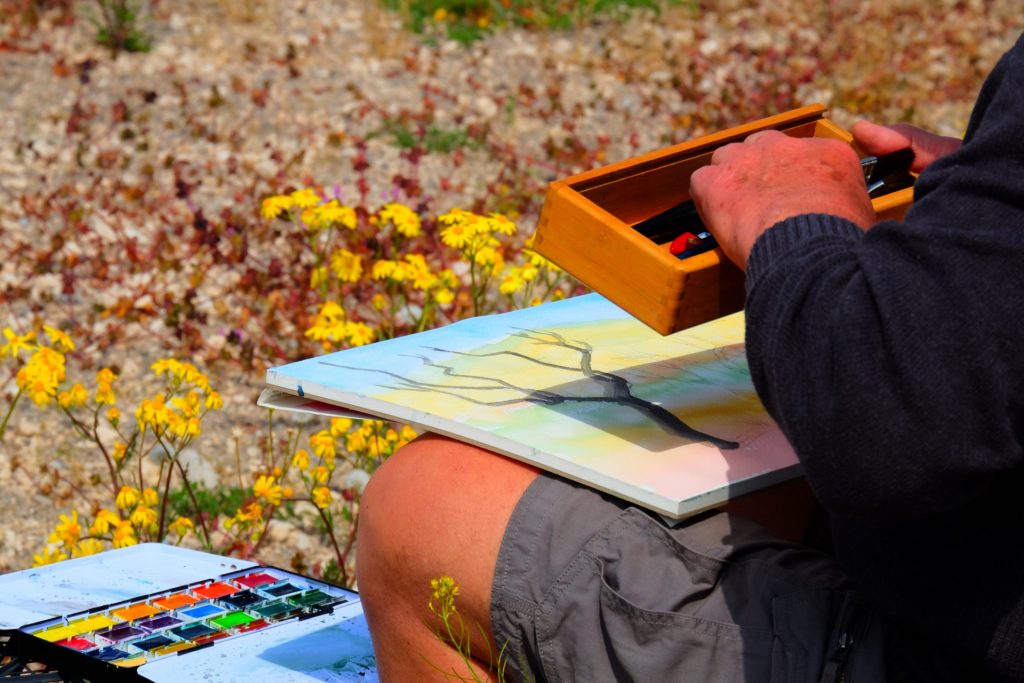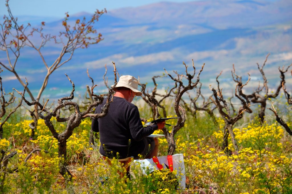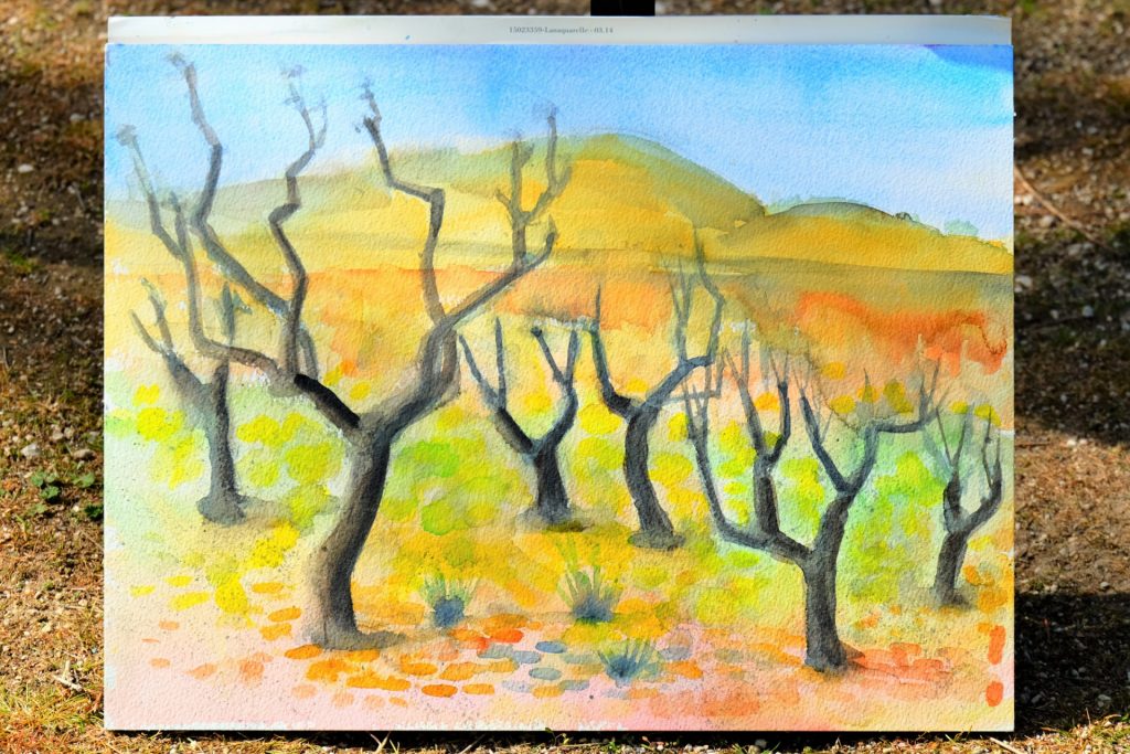 Gegen Mittag begibt sich Dieter zum Aquarellmalen in ein nahes Weinfeld, um diese Farben und Stimmung künstlerisch einzufangen.
