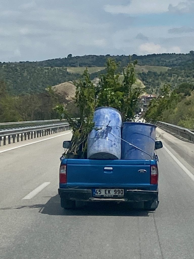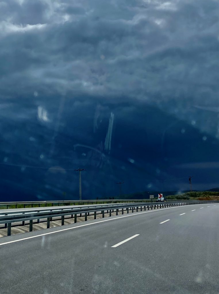 Wir verlassen die Küsten- und damit die Meerregion. Ziel ist Westanatolien mit dem Städtchen Salihli, wohlwissend, dass es hier in der Gegend keinen offiziellen Campingplatz gibt. Vor uns liegen zirka 200 Kilometer auf gut ausgebauten Straßen. Wir folgen einem Transporter mit Grünpflanzen und versuchen diesen in unseren Garten umzuleiten … Dann werden wir allerdings in eine schwarze „Unwetterfront“ geleitet. Es hilft nichts, wir müssen da durch. Kurze Zeit später halten wir allerdings an, da die „Aussichten“ nicht allzu gut sind. Was für Wassermassen.